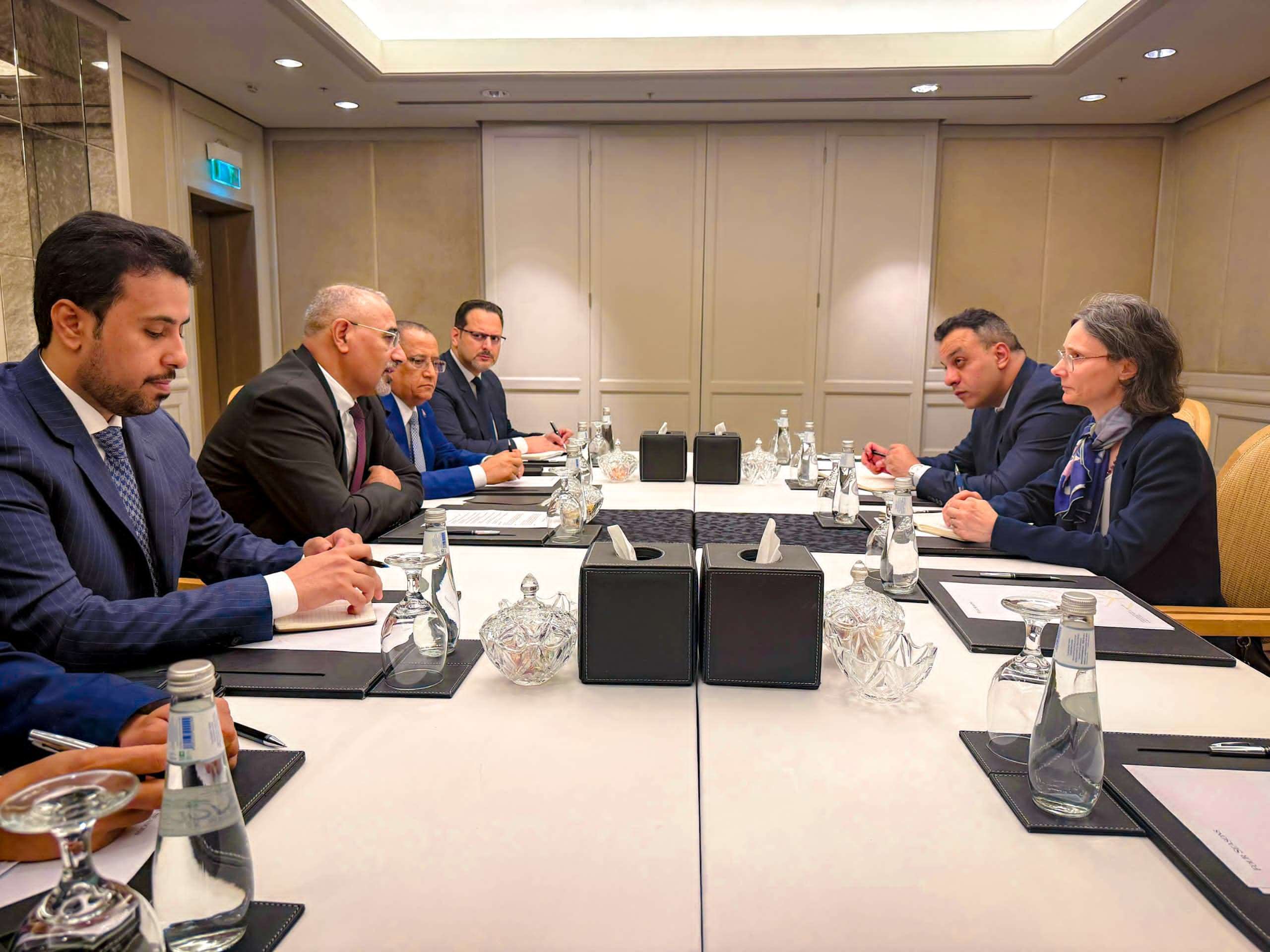 وبحث اللقاء جملة من القضايا السياسية والاقتصادية والإنسانية في بلادنا، وفي مقدمتها الأزمة الاقتصادية المتفاقمة التي تعيشها البلاد نتيجة استمرار توقف صادرات النفط والغاز، جراء الهجمات الإرهابية التي شنتها مليشيا الحوثي على موانئ التصدير في محافظتي حضرموت وشبوة، وما ترتب على ذلك من تراجع في الإيرادات العامة وتدهور الأوضاع المعيشية للمواطنين.