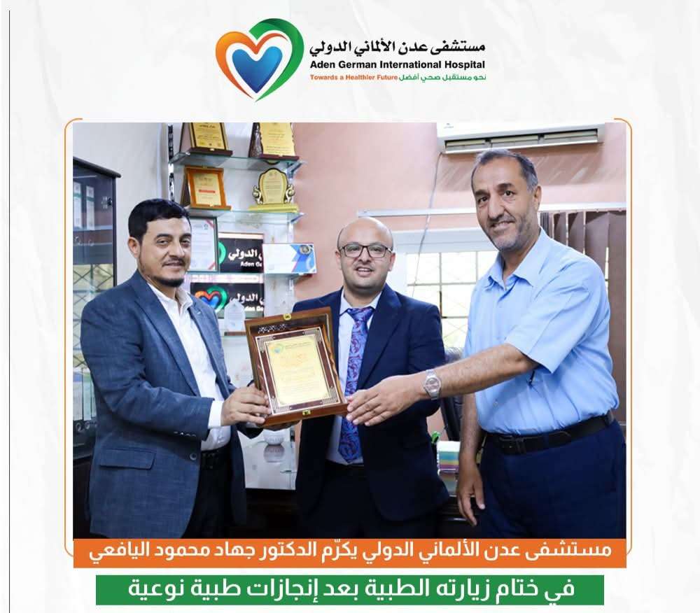 كرّمت إدارة مستشفى عدن الألماني الدولي بالعاصمة عدن الدكتور جهاد محمود اليافعي، استشاري جراحة المخ والأعصاب والعمود الفقري، يوم أمس الاثنين بدرع تذكاري تقديراً لجهوده الحثيثة التي قدّمها خلال زيارته الطبية للمستشفى والتي استمرت خلال أسبوعين كاملين.
