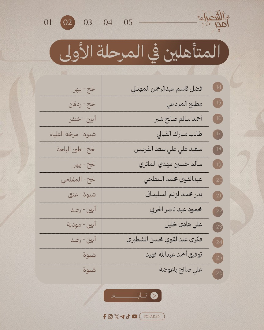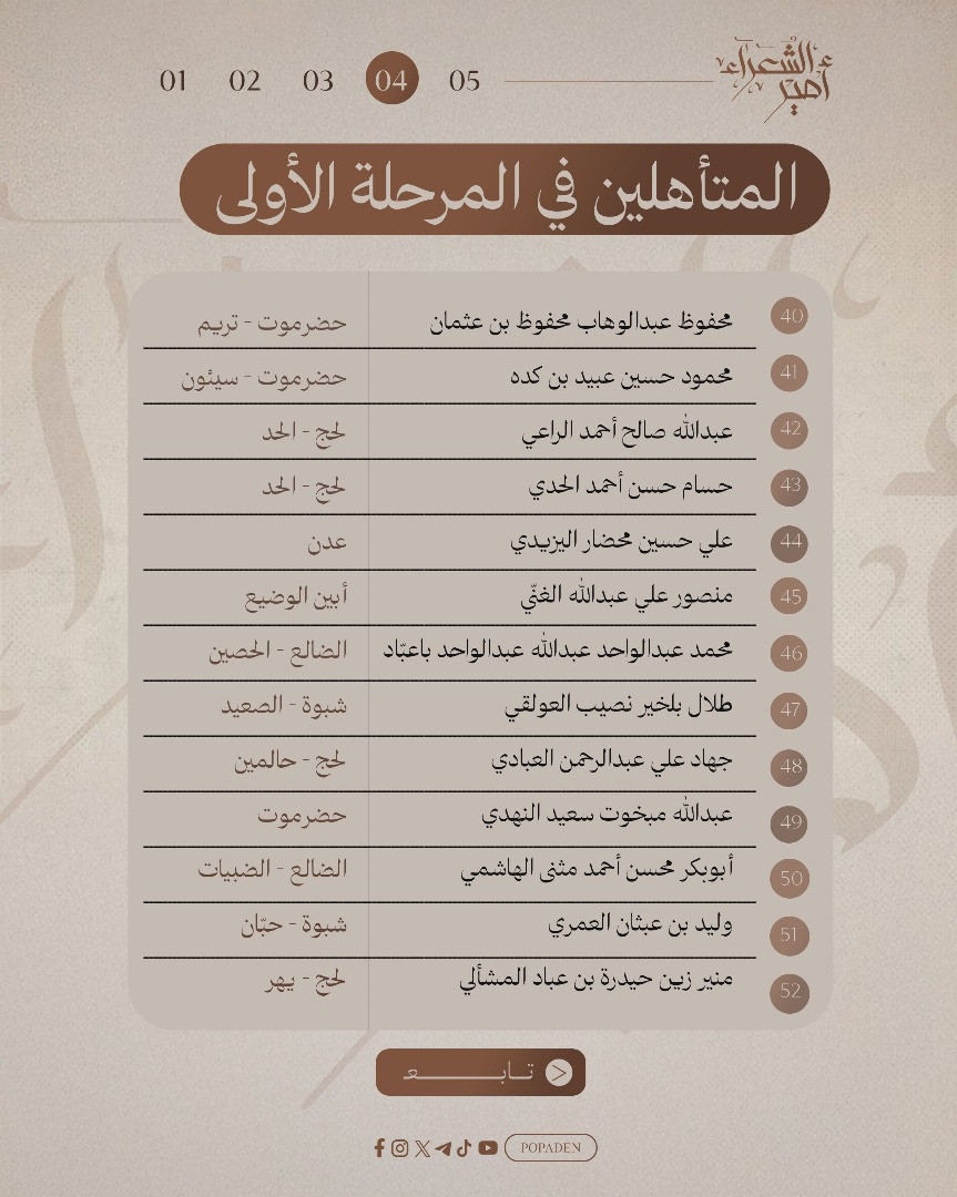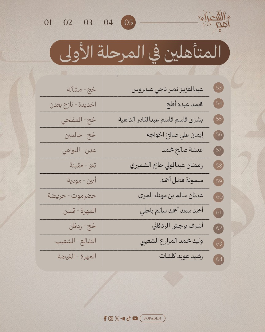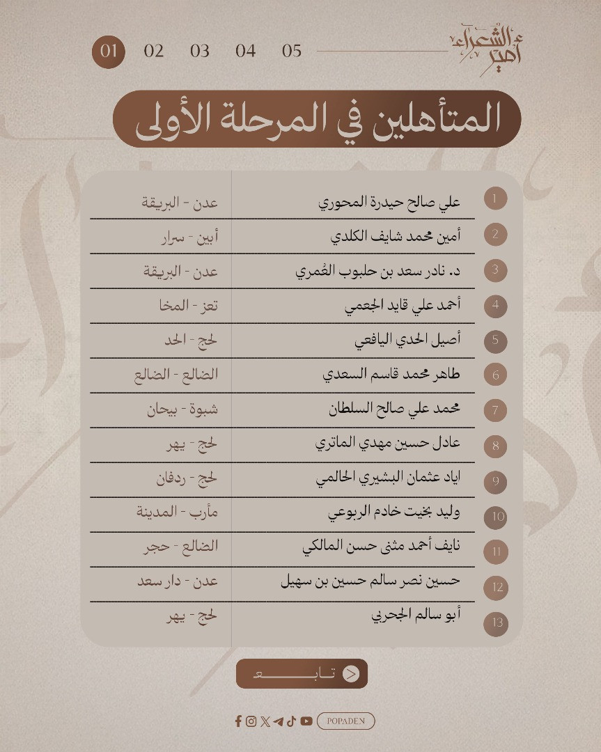 أعلنت لجنة تحكيم "مسابقة أمير الشعراء" في عدن عن تأهل 64 شاعراً في المرحلة الأولى، بعد فرز وتقييم دقيق لما مجموعه 563 قصيدة مستوفية للشروط من أصل 805 نصاً شعرياً تقدّم بها مشاركون من مختلف المناطق المحررة في اليمن.