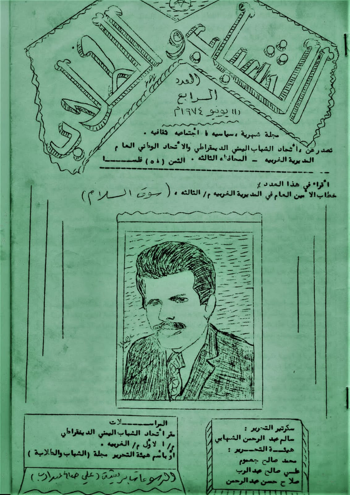 في تلك المرحلة، كنت وزملائي الطلاب من أبناء جيلنا، مشبعين بروح العمل الوطني ، وشغوفاً ومولعاً بالصحافة، وضمن مجموعة من الرفاق الطموحين من اتحاد الشباب والاتحاد الوطني لطلبة اليمن الذي كنت أرأسه في المديرية وأُمَثِّله في عضوية المكتب التنفيذي للمحافظة الثالثة ، أصدرنا نشرة شهرية أسميناها "الشباب والطلاب"، وكنّا نسميها "مجلة" تجاوزاً، تُطبع بالأستانسل وتُسحب بآلة الرونيو، ونوزع منها نحو مئتي نسخة على مراكز المديرية، وحتى ذلك التاريخ، أصدرنا منها أربعة أعداد.
