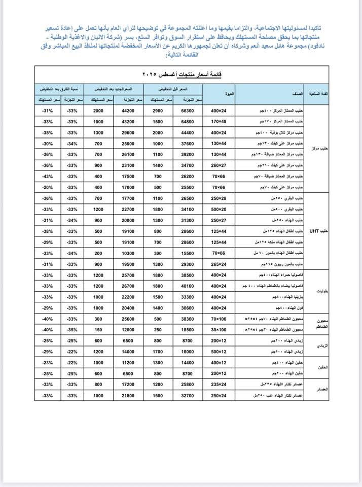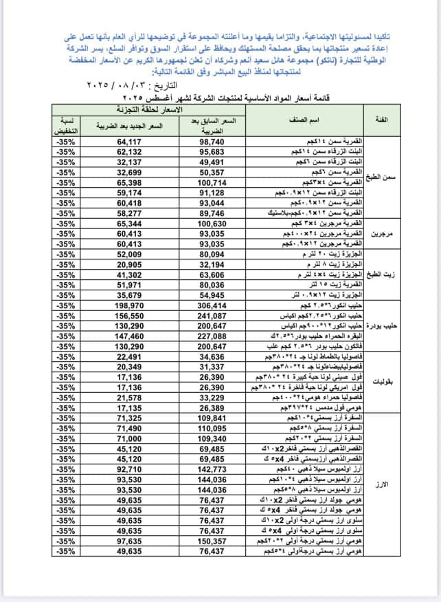مجموعة هائل سعيد أنعم تعلن قائمة الأسعار الجديدة والمخفضة لمنتجاتها الأساسية
