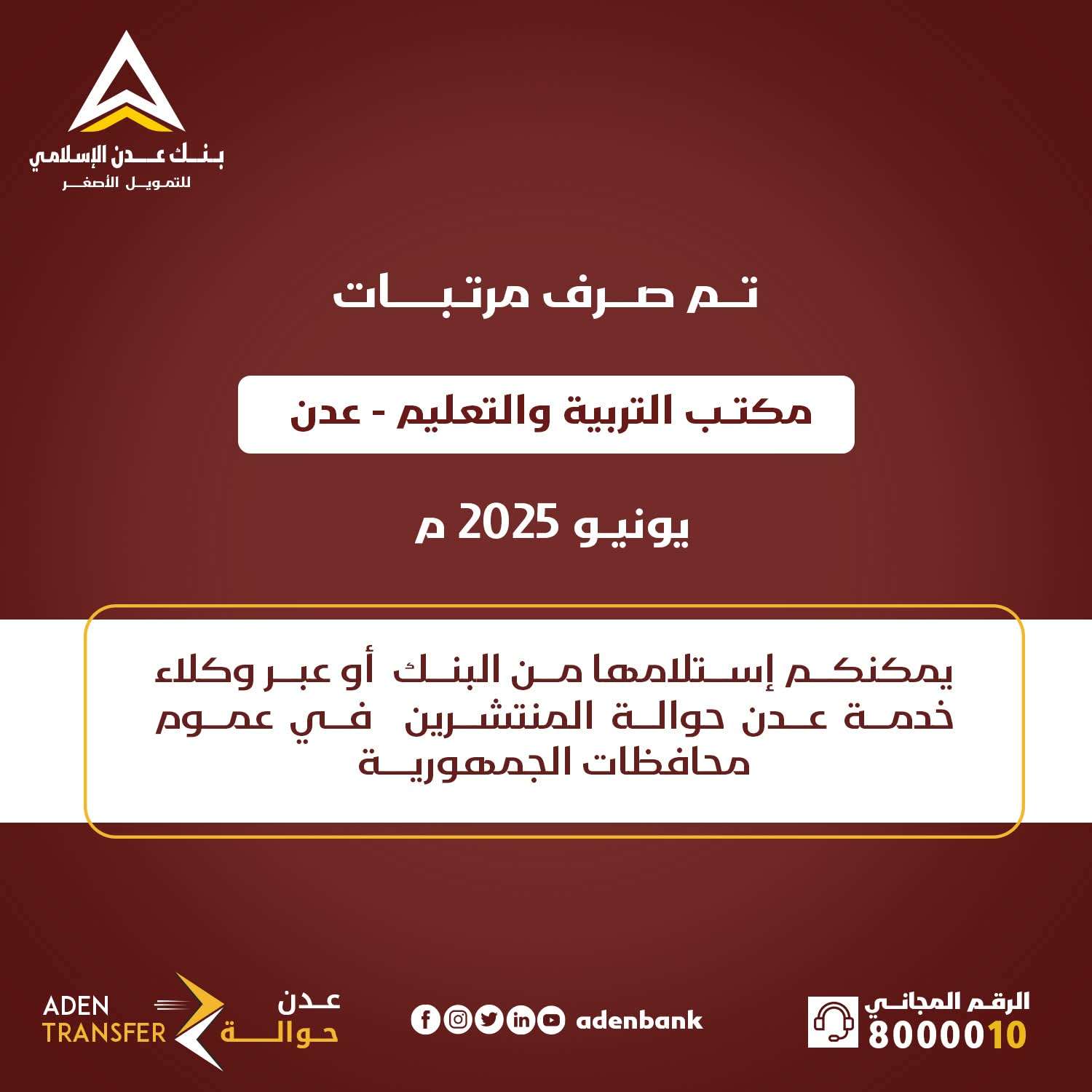 أعلن بنك عدن الإسلامي للتمويل الأصغر بدء صرف مرتبات شهر يونيو 2025 لموظفي مكتب التربية والتعليم في محافظتي عدن وأبين، ابتداءً من اليوم الخميس.