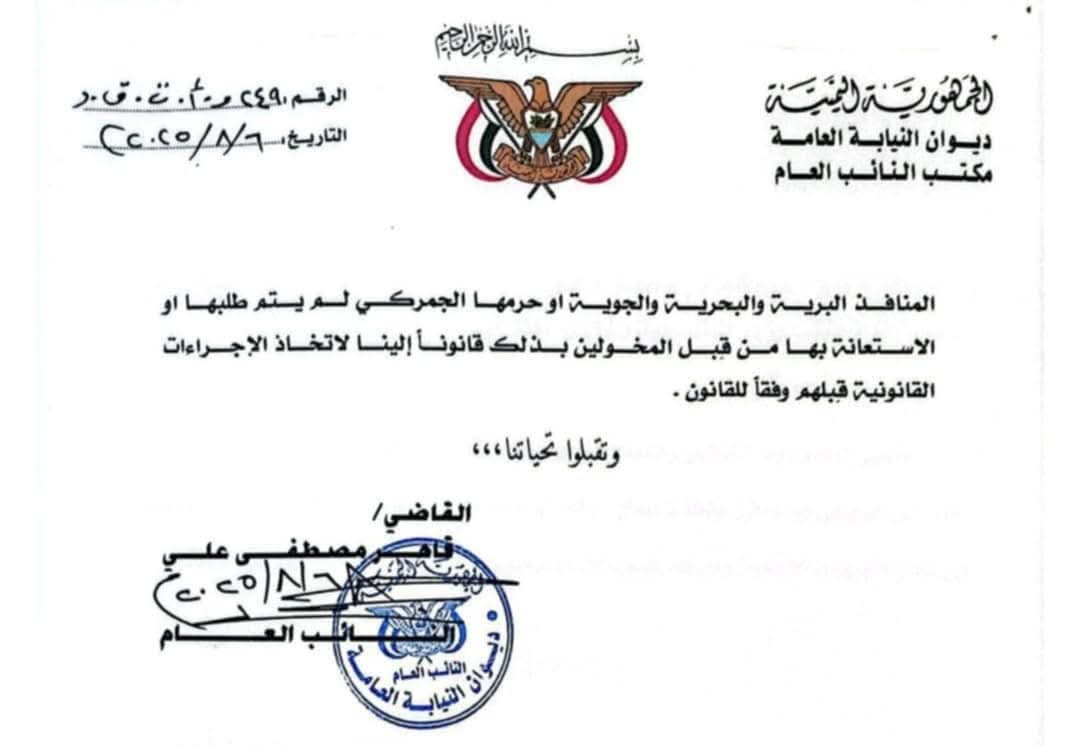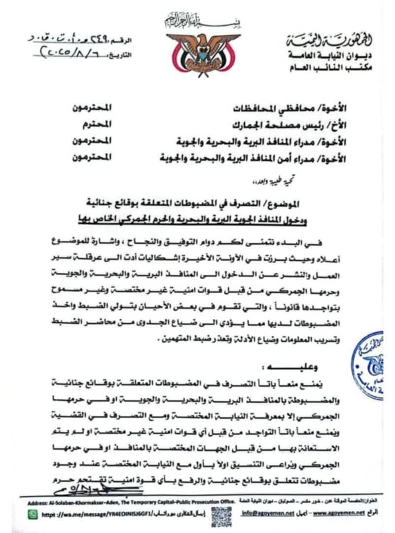 وأكدت المذكرة على حصرية الصلاحية القانونية للنيابة العامة في التعامل مع المضبوطات، ومنع الجهات الأمنية غير المخوّلة من التواجد أو التدخل في عمل المنافذ، محذّرة في الوقت ذاته من أن أي جهة تقوم بتسليم أو التصرف في المضبوطات دون موافقة النيابة العامة ستتحمّل المسؤولية القانونية الكاملة.