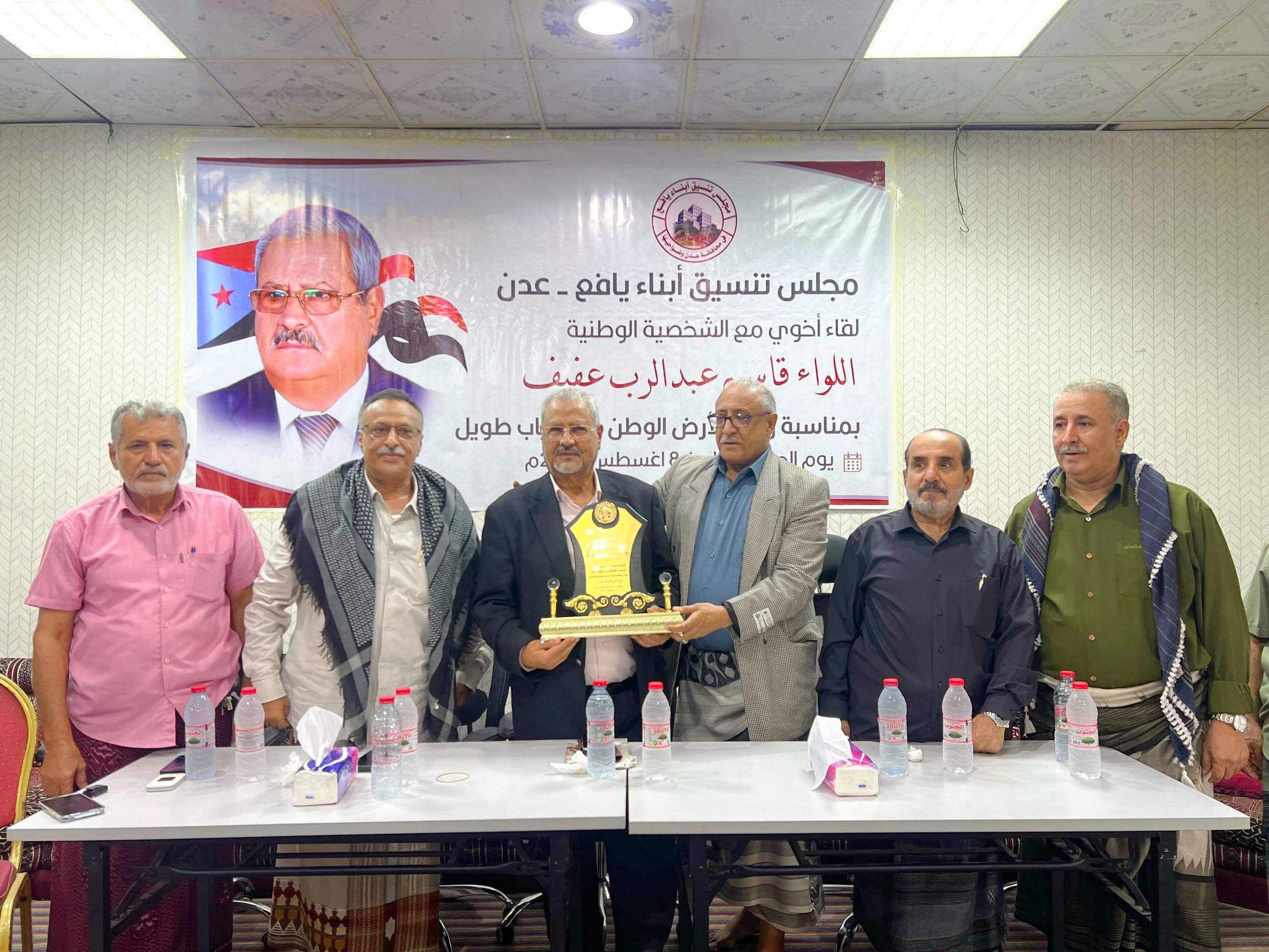 مجلس تنسيق أبناء يافع يحتفي باللواء الركن طيار قاسم عبدالرب عفيف بعودته إلى أرض الوطن