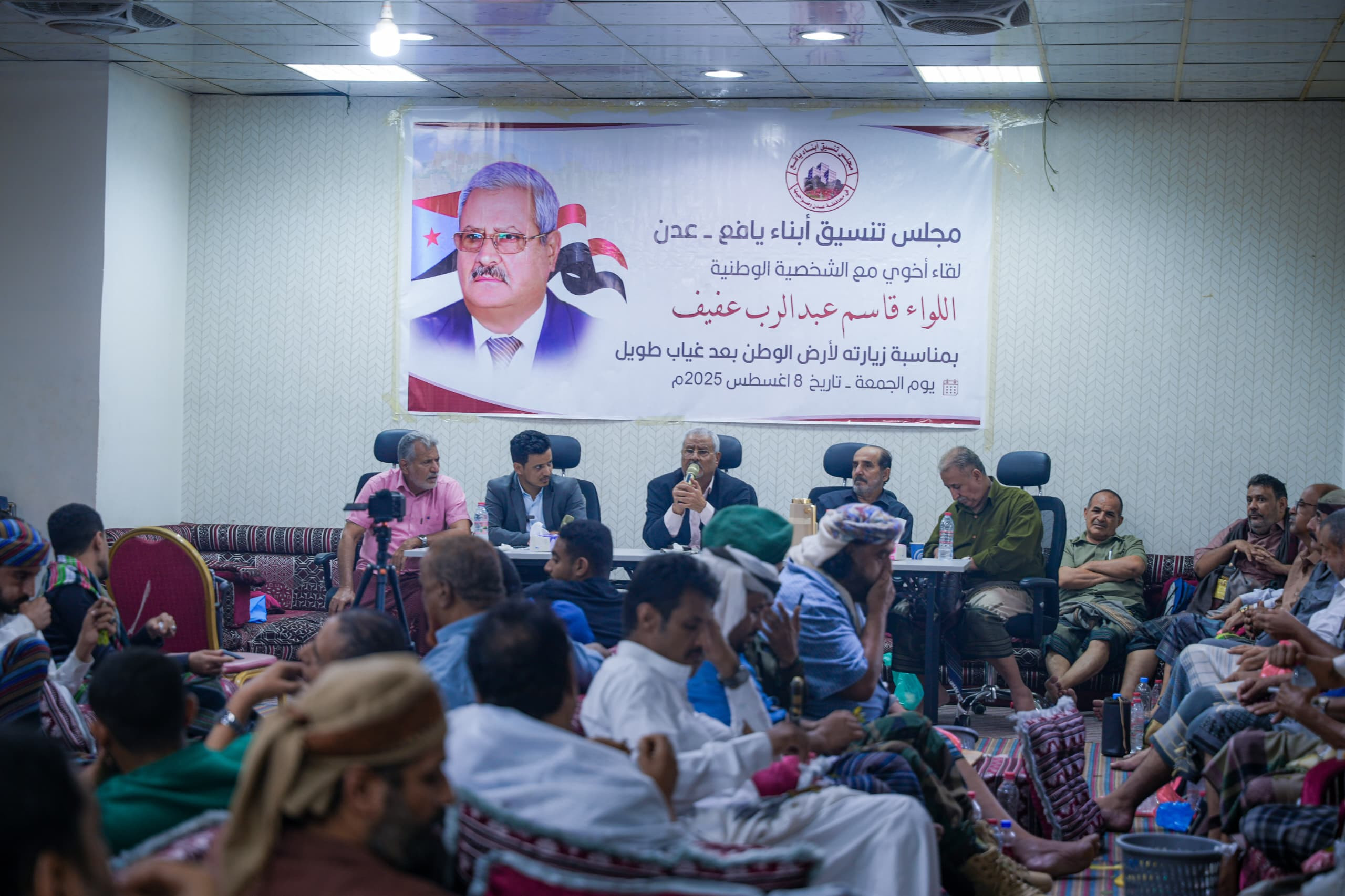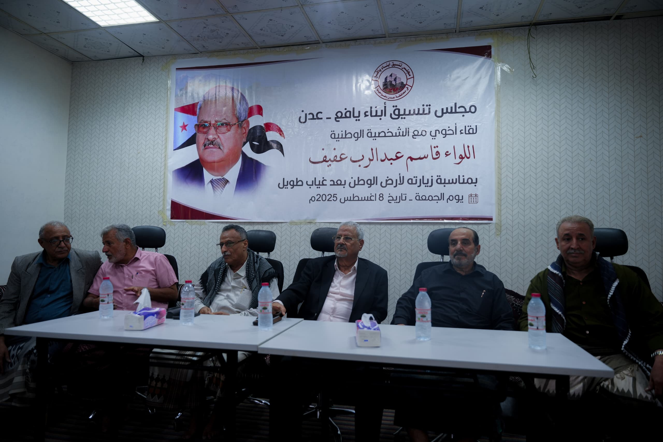 نظّم مجلس تنسيق أبناء يافع – عدن، اليوم الجمعة، لقاءً أخوياً تكريماً للشخصية الوطنية الجنوبية البارزة، اللواء الركن طيار قاسم عبدالرب صالح العفيف، بمناسبة زيارته لأرض الوطن بعد غياب طويل.