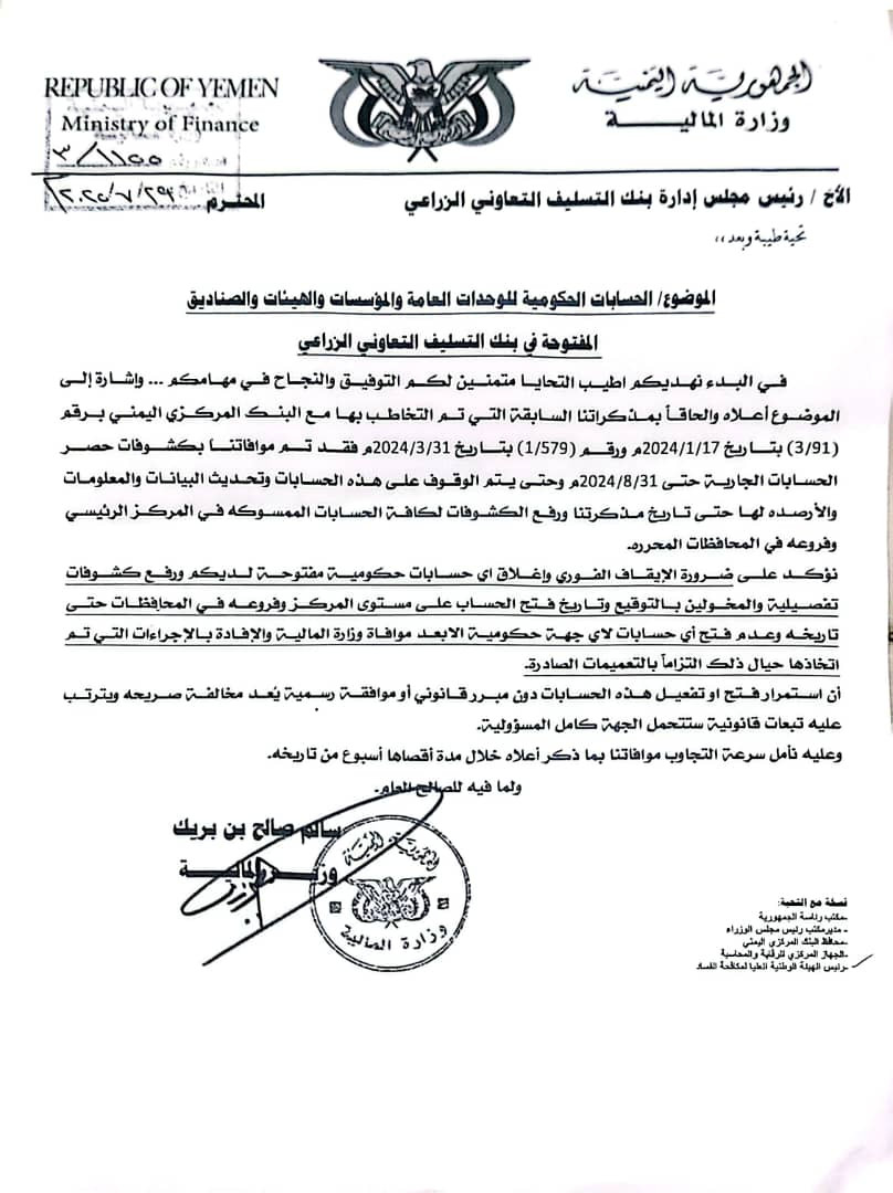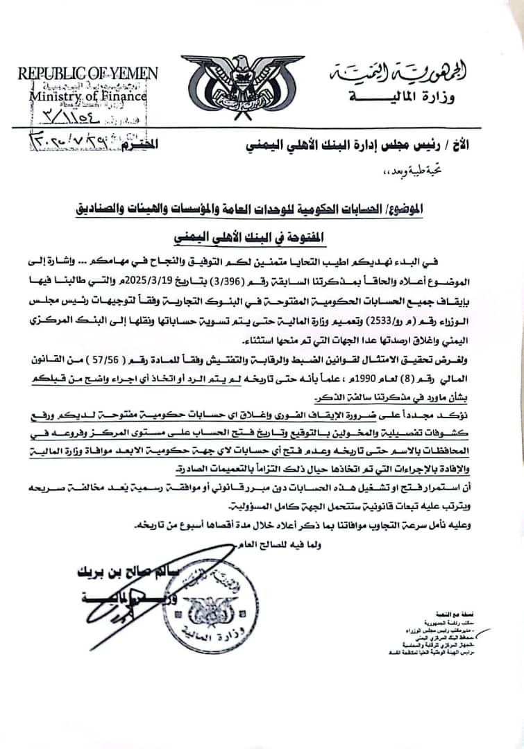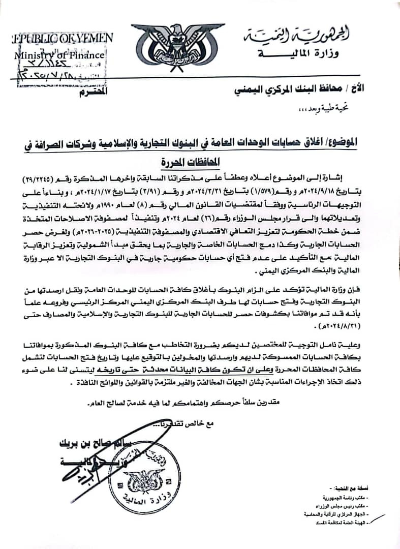 وتكشف الوثائق عن توجيهات حكومية واضحة وصريحة بضرورة إغلاق جميع الحسابات الحكومية للوحدات الإدارية والمؤسسات العامة والهيئات والصناديق في كافة البنوك التجارية والإسلامية وشركات الصرافة العاملة بالمحافظات المحررة، ونقل كامل أرصدتها إلى البنك المركزي اليمني، التزامًا بالقوانين واللوائح المالية النافذة، بما في ذلك قانون البنك المركزي وقانون النظام المالي والإداري للدولة.
