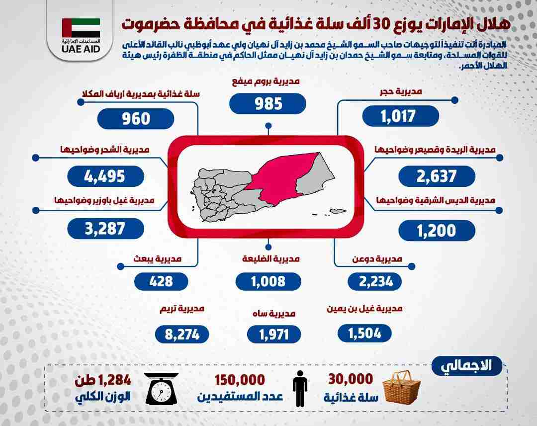 وتمكنت الإمارات عبر ذراعها الإنساني هيئة الهلال الأحمر الإماراتية خلال شهر رمضان المبارك، من توزيع (30,000) سلة غذائية من المير الرمضاني بضرموت، تزن (1,284 طناً)، استفاد منها 150,000 فرداً من الأسر الفقيرة وذوي الدخل المحدود.