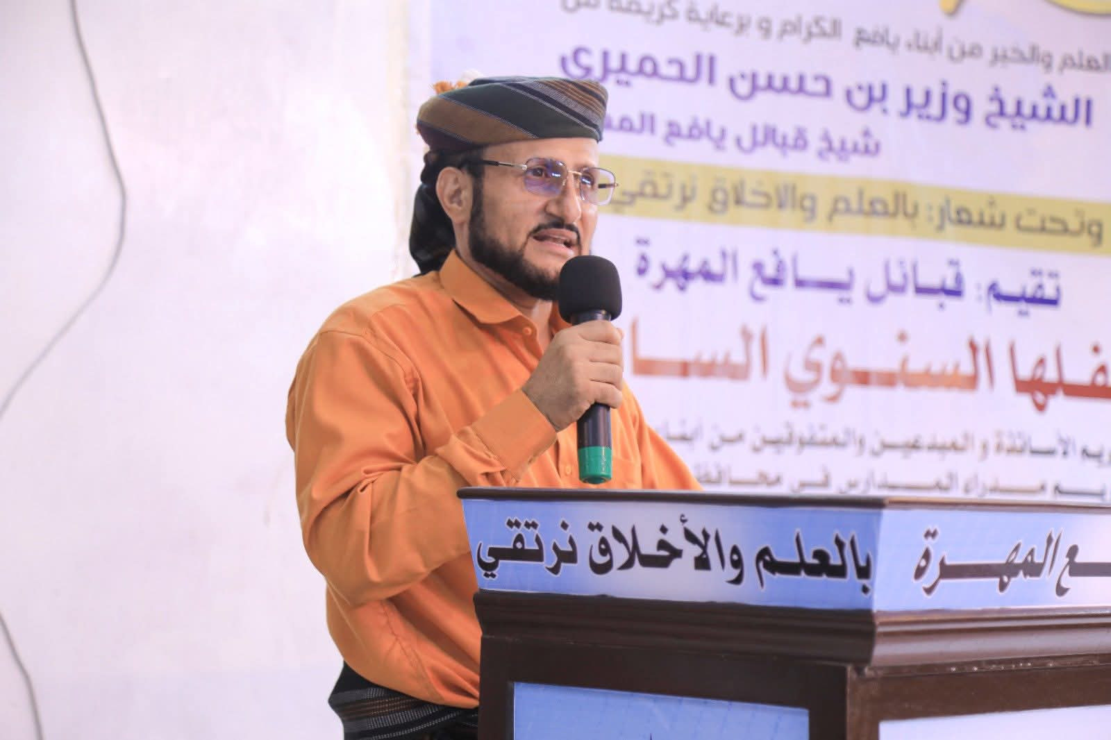 وقدّم الشيخ وزير الحميري شكره وتقديره للسلطة المحلية وضيوف الشرف وقيادة المجلس الانتقالي الجنوبي، كما عبّر عن امتنانه لأولياء الأمور وكل المهتمين بالتعليم، مثمناً في الوقت ذاته جهود اللجنة الإشرافية التي أسهمت في إنجاح الفعالية.