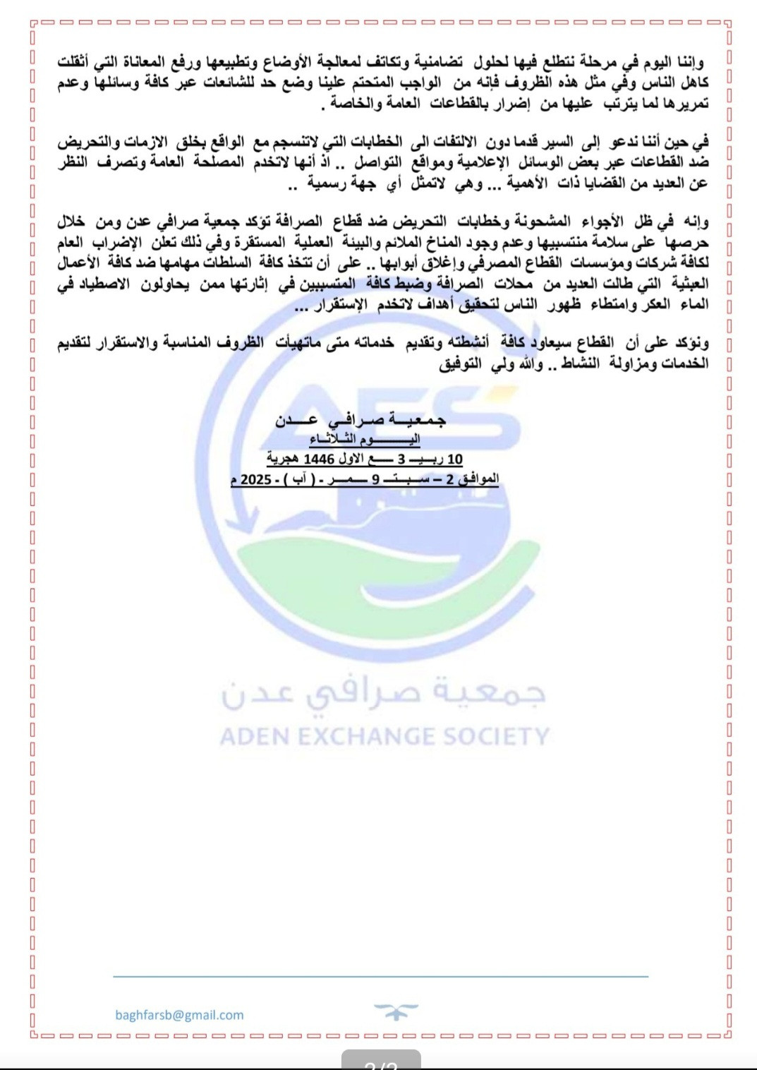 كما شددت جمعية صرافي عدن على ضرورة تضافر الجهود لمواجهة التحديات الراهنة، وفي مقدمتها المضاربات التي تستهدف العملة الوطنية، داعية الجهات الرسمية والأمنية إلى تكثيف الرقابة والحد من الأنشطة غير القانونية، وحماية الاقتصاد الوطني من محاولات العبث.