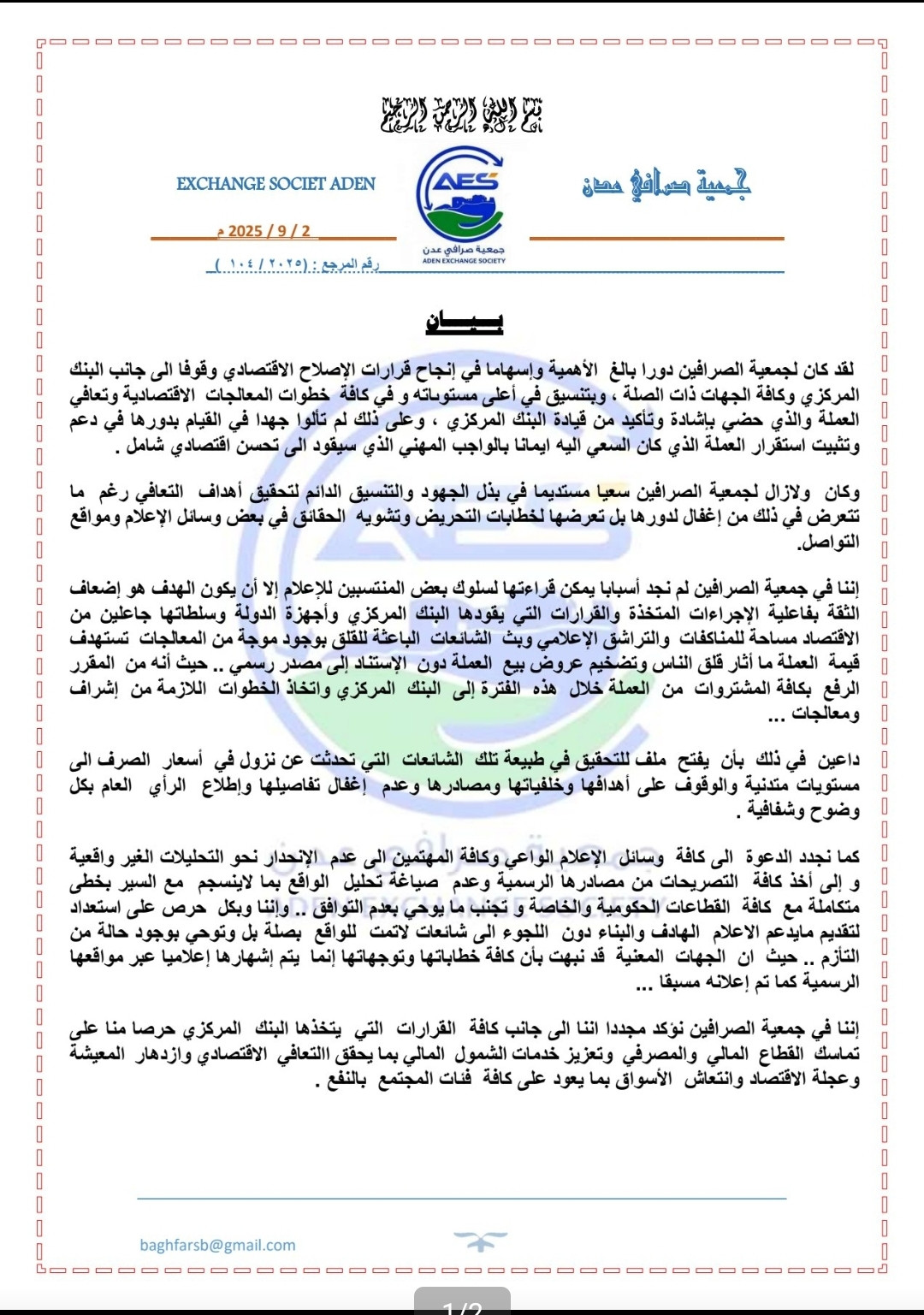 وأشار البيان إلى أن الجمعية تولي أهمية كبرى لدعم خطوات البنك المركزي اليمني في عدن، بما يحقق الشفافية والالتزام المهني، مؤكدة أن التعاون بين البنك المركزي وقطاع الصرافة هو السبيل الأمثل لإيجاد معالجات عملية تضمن تعزيز الاستقرار المالي والحد من الآثار السلبية للتقلبات السعرية.