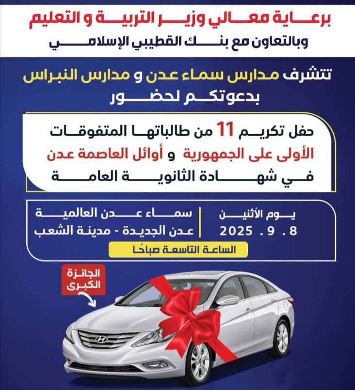 الجدير بالذكر أن مدارس سماء عدن والنبراس تُعدّ من المؤسسات التعليمية الرائدة في العاصمة عدن ولها سجل حافل بالإنجازات الوطنية والعربية، فيما يواصل بنك القطيبي الإسلامي للتمويل الأصغر ريادته المجتمعية من خلال رعاية المبادرات التعليمية والتنموية.