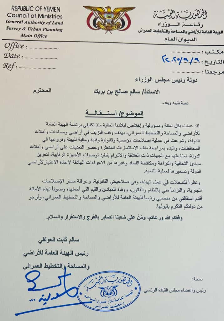 قدّم رئيس الهيئة العامة للأراضي والمساحة والتخطيط العمراني المهندس سالم ثابت العولقي، اليوم الإثنين 8 سبتمبر 2025م، استقالته رسميًا إلى دولة رئيس مجلس الوزراء الدكتور سالم صالح بن بريك.