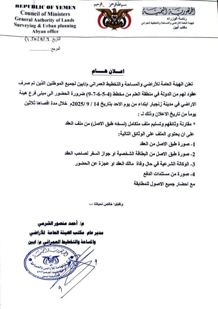 تعلن الهيئة العامة للأراضي والمساحة والتخطيط العمراني م/ابين لجميع الموطنين الذين تم صرف عقود لهم من الدولة في منطقة العلم من مخطط (4-5-6-7-9) ضرورة الحضور الى مبنى فرع هيئة الاراضي في مدينة زنجبار ابتداء من يوم الاحد بتاريخ 14 / 2025/9م خلال مدة اقصاها ثلاثين يوماً من تاريخ الاعلان وذلك لـ :