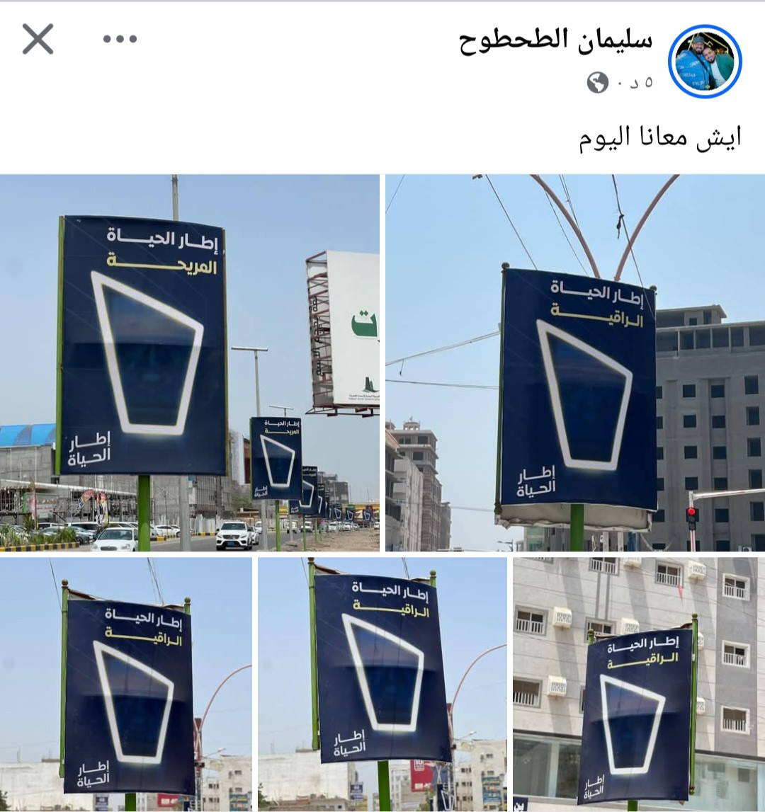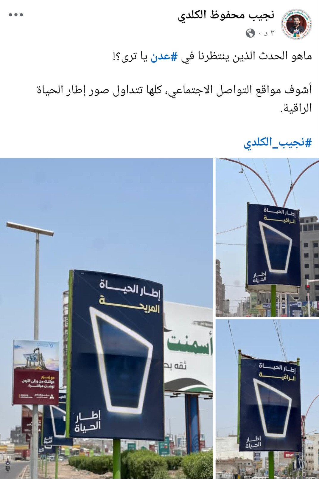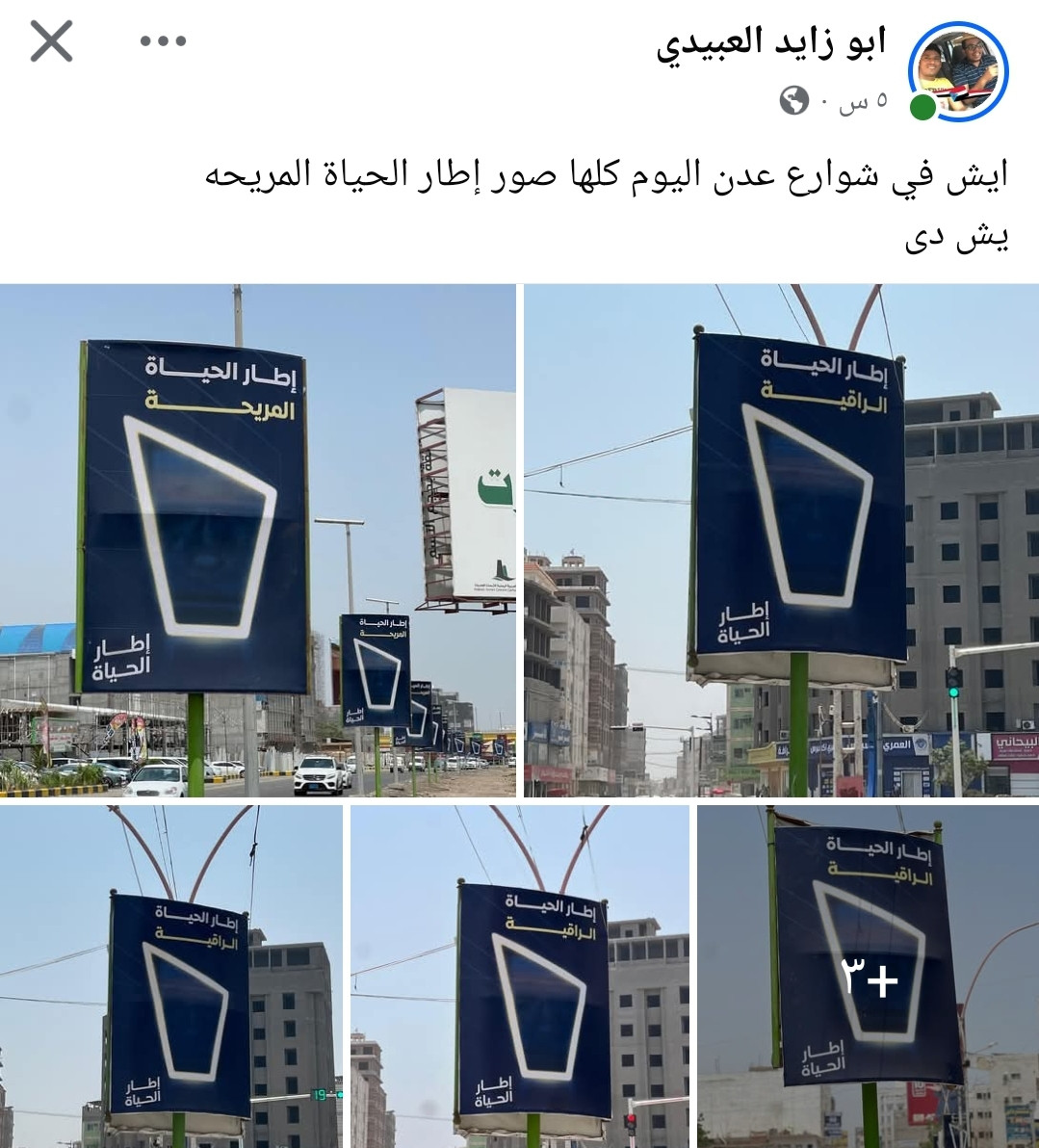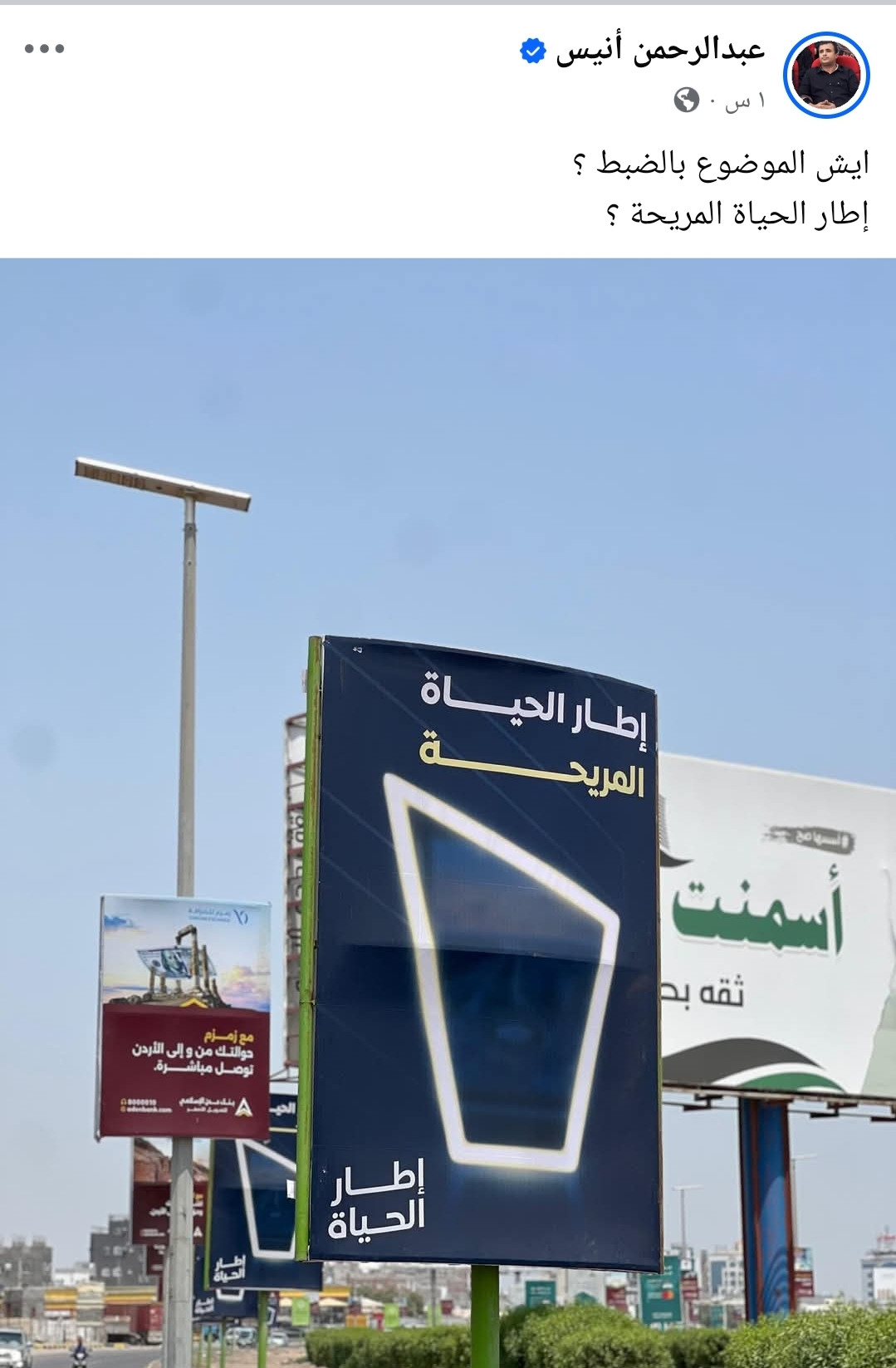 تداول صحفيون وناشطون على منصات التواصل الاجتماعي في مدينة عدن، صوراً للوحـات إعلانية انتشرت بشكل لافت في عدد من الشوارع الرئيسية، تحمل شكلاً لإطار غير متوازي الأضلاع، كُتب فوقه عبارات من قبيل: "إطار الحياة المريحة" وأخرى "إطار الحياة الراقية".