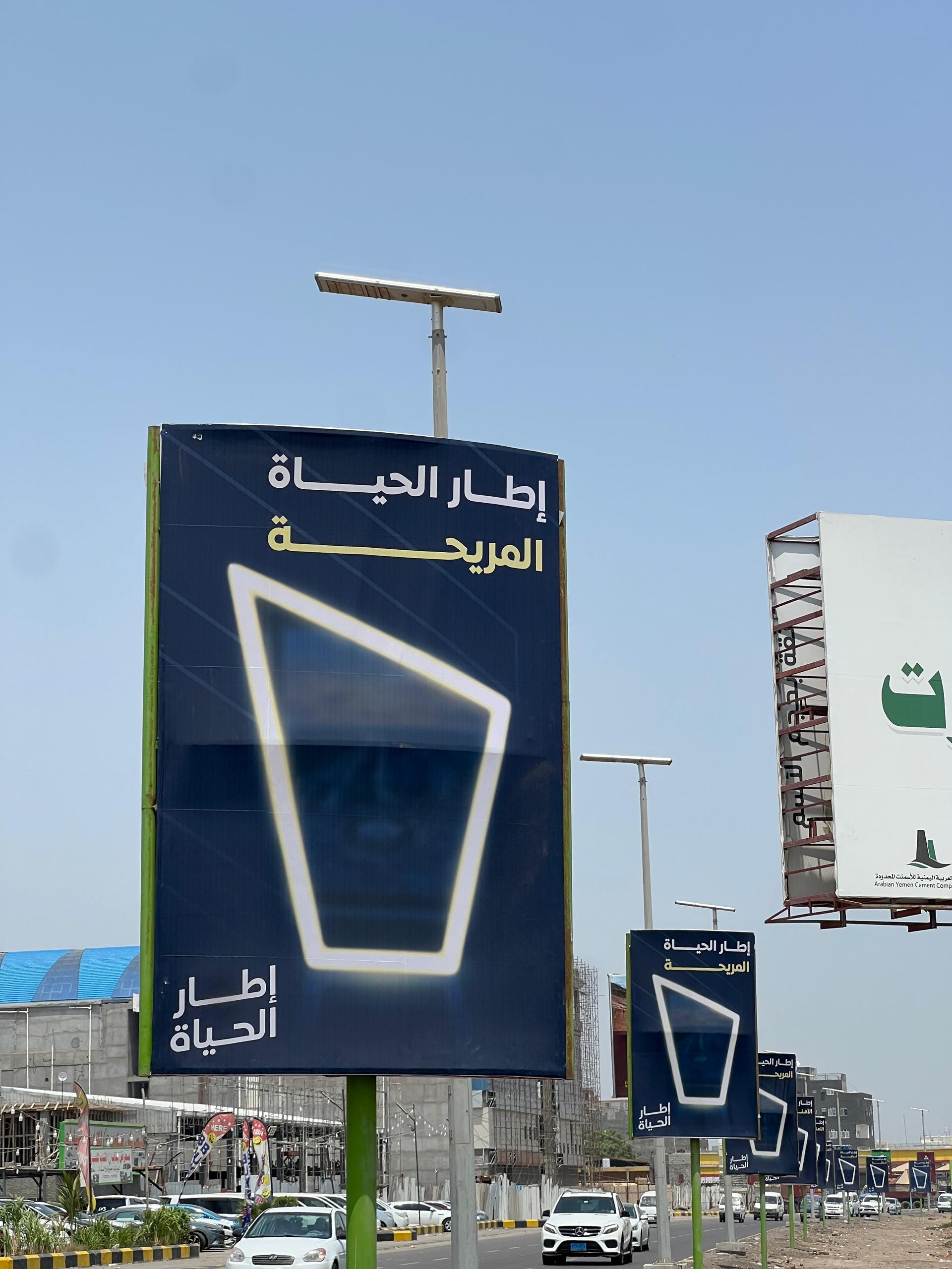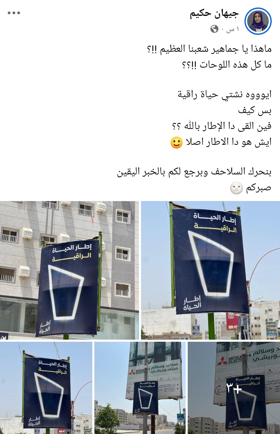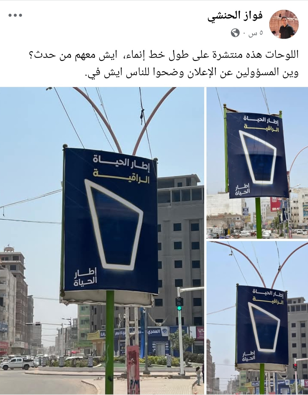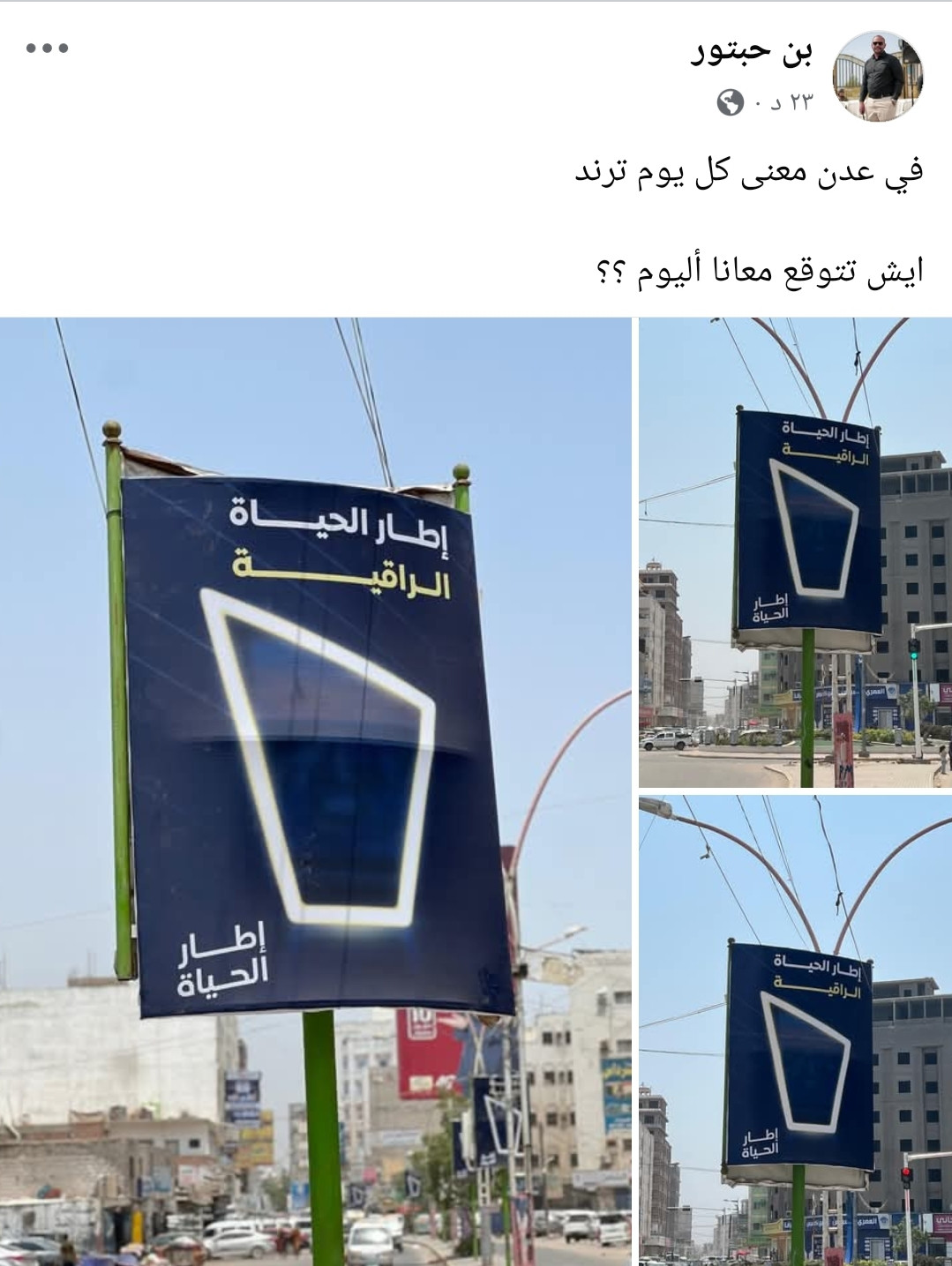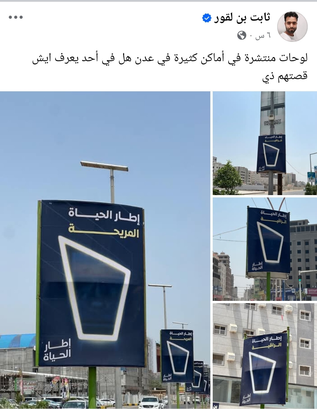 تداول صحفيون وناشطون على منصات التواصل الاجتماعي في مدينة عدن، صوراً للوحـات إعلانية انتشرت بشكل لافت في عدد من الشوارع الرئيسية، تحمل شكلاً لإطار غير متوازي الأضلاع، كُتب فوقه عبارات من قبيل: "إطار الحياة المريحة" وأخرى "إطار الحياة الراقية".