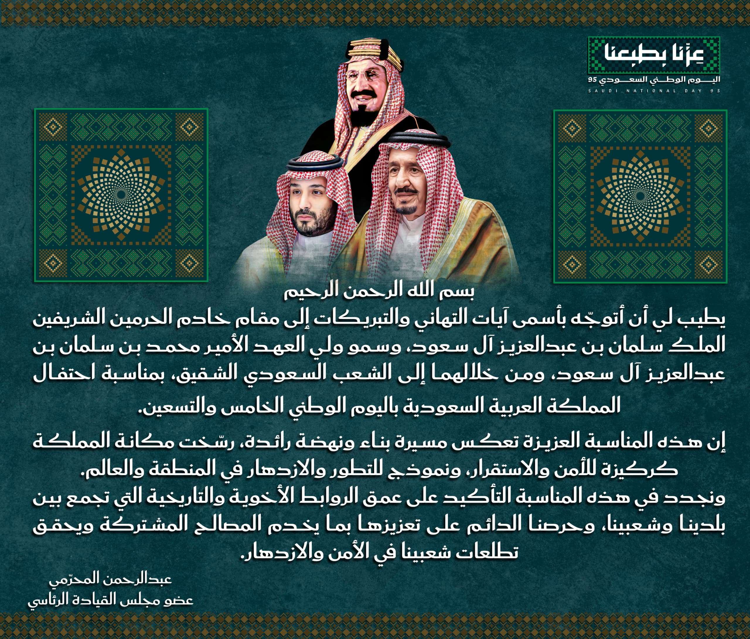 المحرّمي يهنئ خادم الحرمين الشريفين وولي عهده باليوم الوطني السعودي الـ95