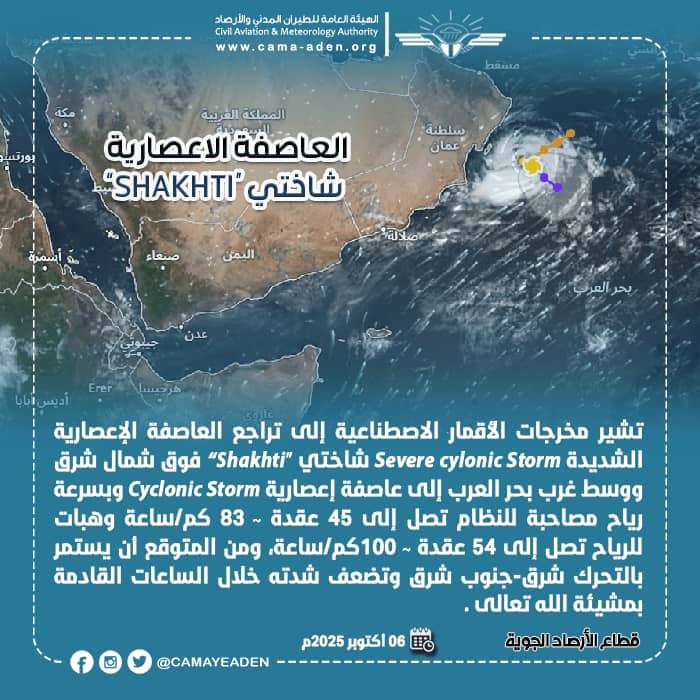 أوضح مركز التنبؤات الجوية والإنذار المبكر التابع للهيئة العامة للطيران المدني والأرصاد، أن العاصفة الإعصارية الشديدة Severe cylonic Storm "شاختي “Shakhti”، فوق شمال شرق ووسط غرب بحر العرب، تراجعت إلى عاصفة إعصارية Cyclonic Storm، وبسرعة رياح مصاحبة للنظام تصل إلى 45 عقدة ~ 83 كم/ساعة، وهبات للرياح تصل إلى 54 عقدة ~ 100كم/ساعة، وذلك بحسب ما أشارت إليه مخرجات الأقمار الاصطناعية.