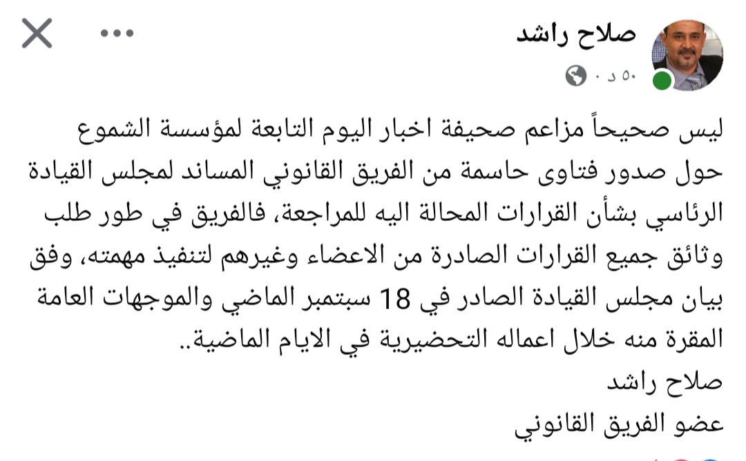 نفى القاضي صلاح راشد، عضو الفريق القانوني المساند لمجلس القيادة الرئاسي، صحة ما نشرته صحيفة "أخبار اليوم" التابعة لمؤسسة الشموع بشأن صدور فتاوى حاسمة من الفريق حول القرارات المحالة إليه للمراجعة.