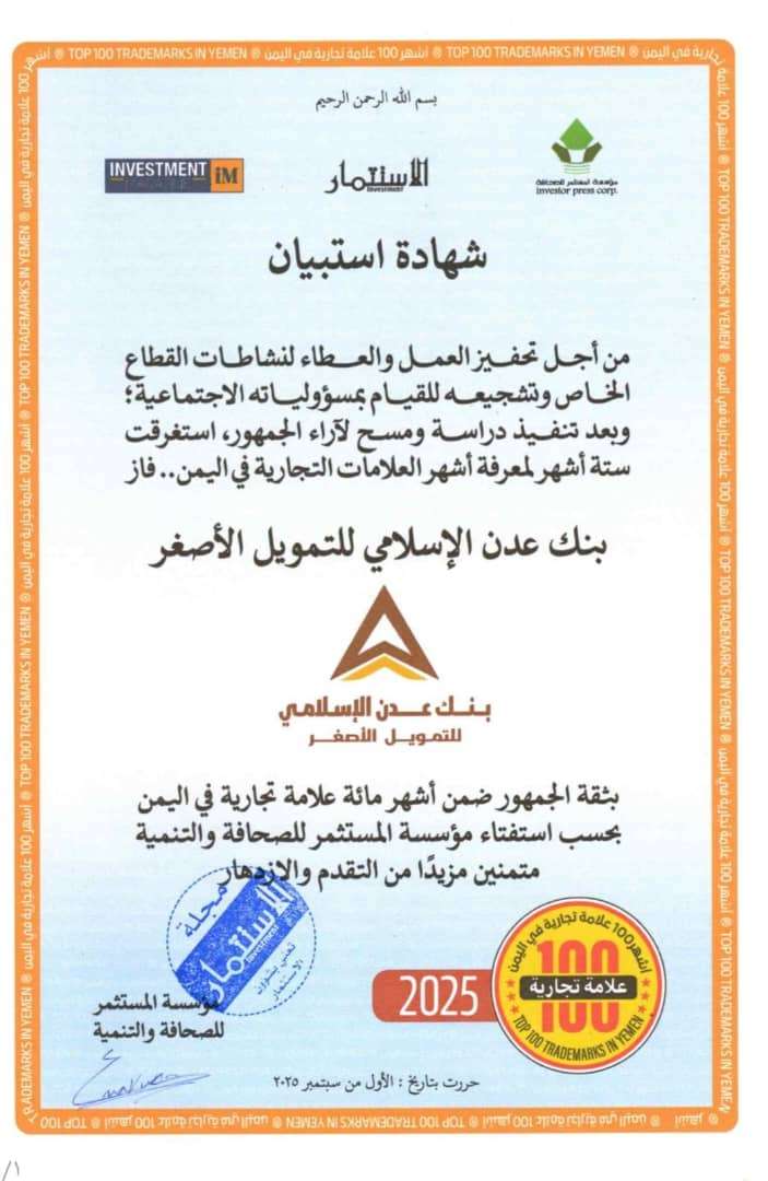 بنك عدن الإسلامي للتمويل الأصغر ضمن أشهر 100 علامة تجارية في اليمن