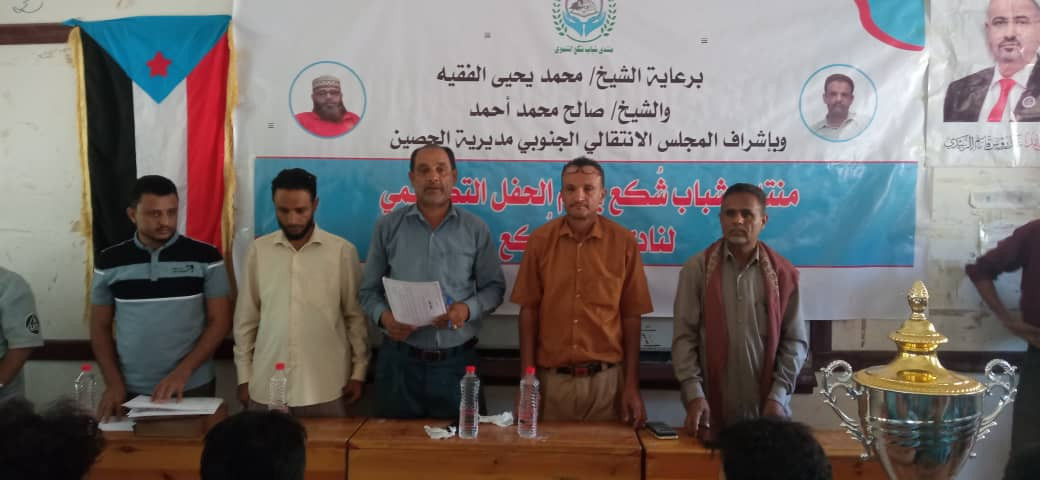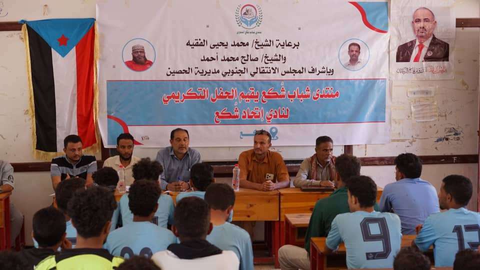 أقام صباح اليوم منتدى شباب شكع التنموي بمنطقة شكع مديرية الحصين حفلاً تكريمياً للاعبي اتحاد شكع الرياضي الفائز بكأس دوري الحصين وذلك برعاية كريمة من الشيخ محمد يحيى الفقية والشيخ صالح محمد احمد وتحت إشراف المجلس الانتقالي الجنوبي بالمديرية