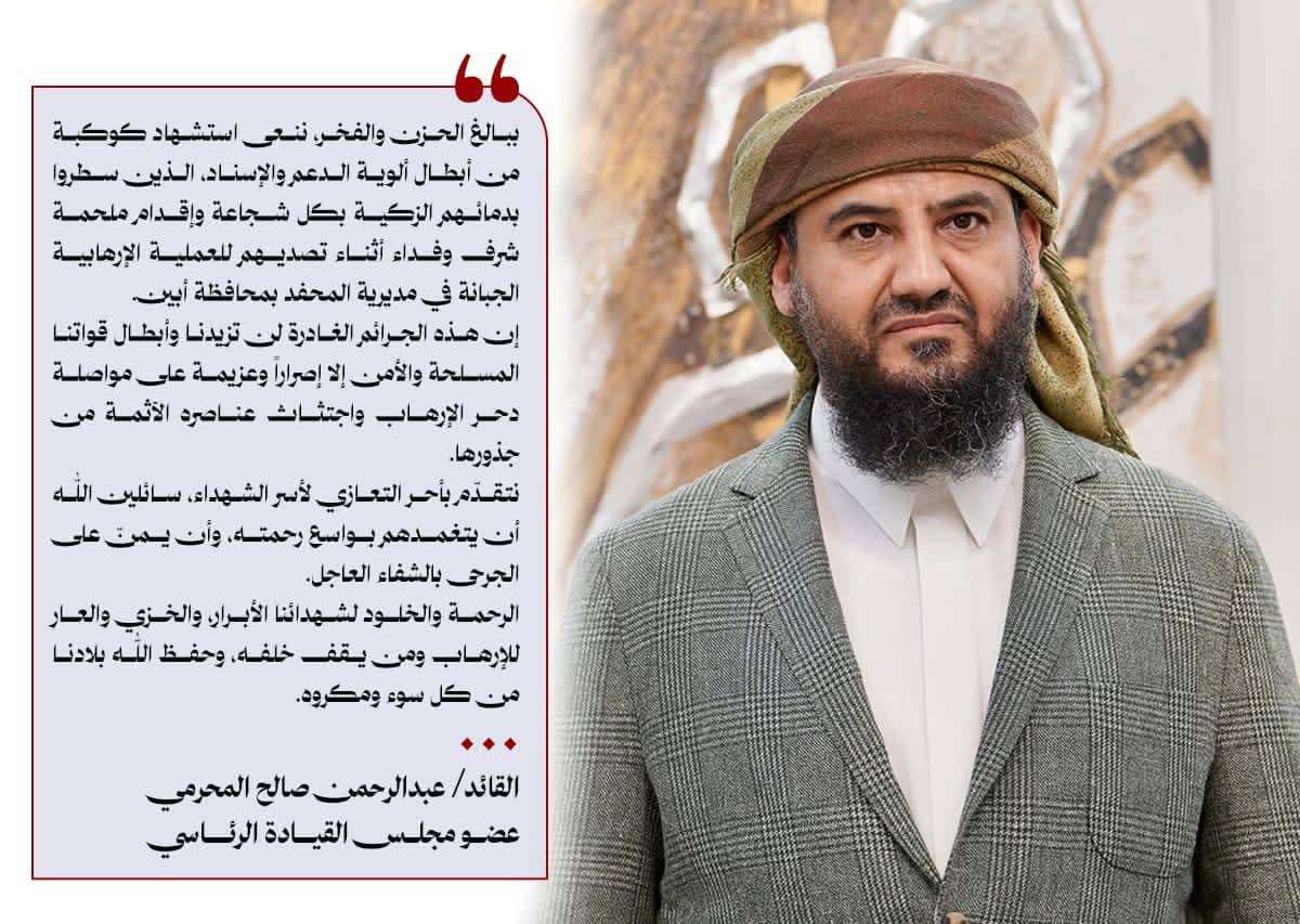 القائد المحرّمي ينعي شهداء ألوية الدعم والإسناد بأبين ويؤكد استمرار اجتثاث الإرهاب