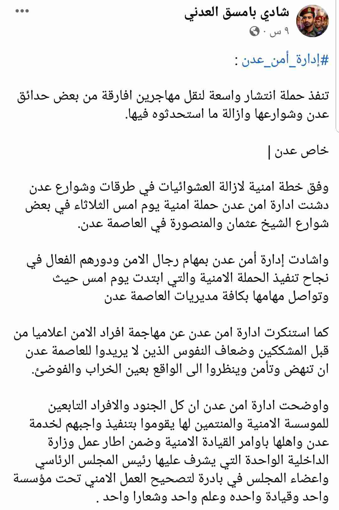 وقال في التوضيح : "نحذر كافة وسائل الاعلام والاعلاميين من اعتماد ما ينشر في هذه الصفحة المزيفة ومجهولة الهوية كما أننا نؤكد أن هذا الخبر غير موجود بالصفحة الرسمية للمكتب الإعلامي لادارة أمن عدن وكذلك ليس بالموقع الرسمي للقوات المسلحة الجنوبية (درع الجنوب)".