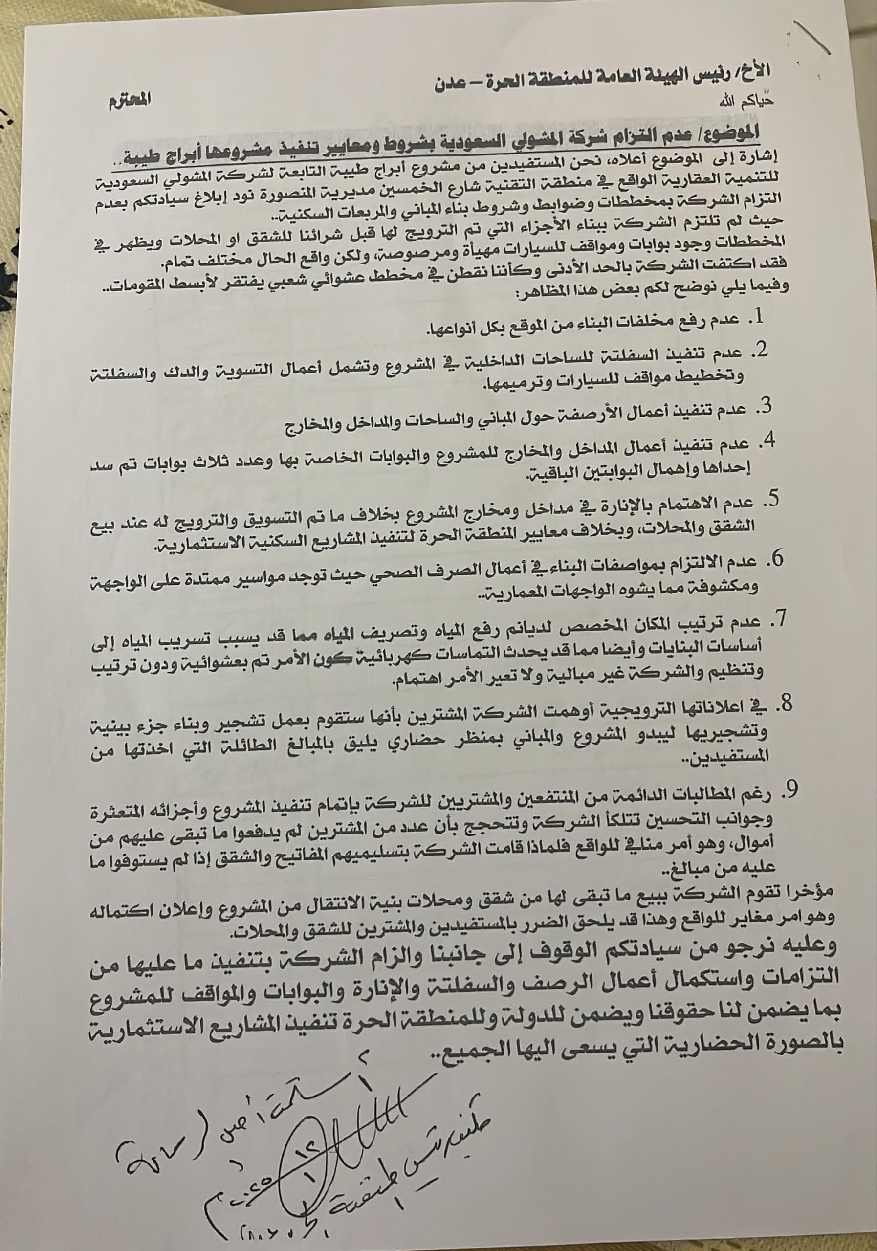 وأضافوا أن الشركة بدأت مؤخراً بيع وحدات جديدة والانتقال لمشروعات أخرى قبل استكمال التزاماتها في مشروع أبراج طيبة، وهو ما اعتبروه تجاوزاً صريحاً للعقود الموقعة وحقوق المشترين.