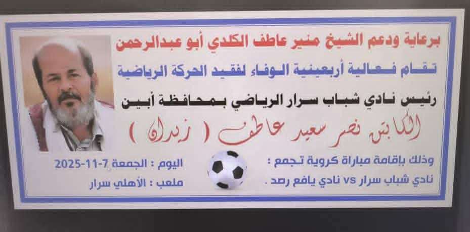 تحتفي مديرية سرار يافع بأبين عصر الجمعة القادم باحياء أربعينية الوفاء لفقيد الحركة الرياضية ورئيس نادي شباب سرار الرياضي الكابتن نصر سعيد عاطف زيدان (رحمه الله)، من خلال تنظيم مواجهة كروية تجمع بين فريقي ناديي شباب سرار ويافع رصُد على ملعب الأهلي بمديرية سرار، بمشاركة نخبة من أبرز نجوم الكُرة في يافع وأبين والتي تأتي وفاءً وعرفاناً للفقيد ولدوره الرياضي في خدمة نادي سرار والحركة الرياضية في المديرية.