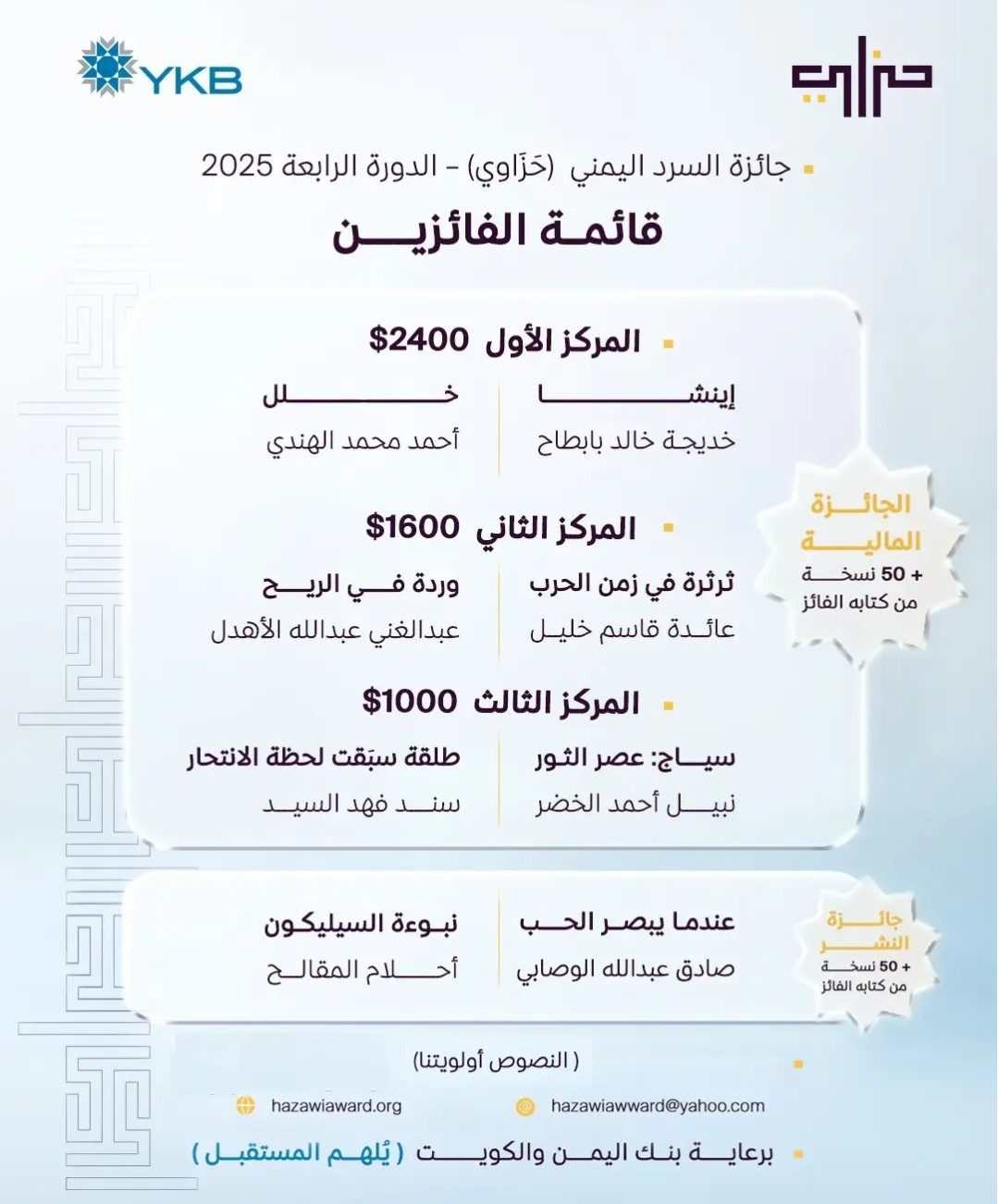 حصدت الروايتان "إينشا" لخديجة بابطاح، و"خلل" لأحمد الهندي؛ المركز الأول، في الموسم الرابع، من "حَزَاوِي" جائزة السردي اليمني للروايات المخطوطة غير المنشورة، للعام 2025م، وتقاسمت أربع روايات المركزين الثاني والثالث في الجائزة المالية، كما تشاركت روايتين في جائزة النشر.