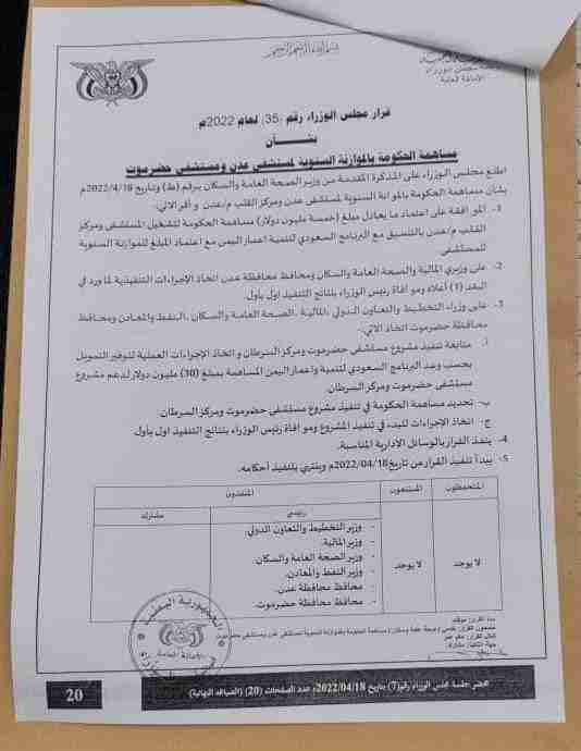 ووفق المذكرة التي ارفقها الوزير بحيبح في تغريدة على حسابه بموقع (تويتر) فقد أصدر مجلس الوزراء قرارا قضى بالموافقة على اعتماد ما يعادل مبلغ خمسة مليون دولار مساهمة من الحكومة لتشغيل المستشفى ومركز القلب بعدن بالتنسيق مع البرنامج السعودي لتنمية وإعمار اليمن مع اعتماد المبلغ للموازنة السنوية للمستشفى.