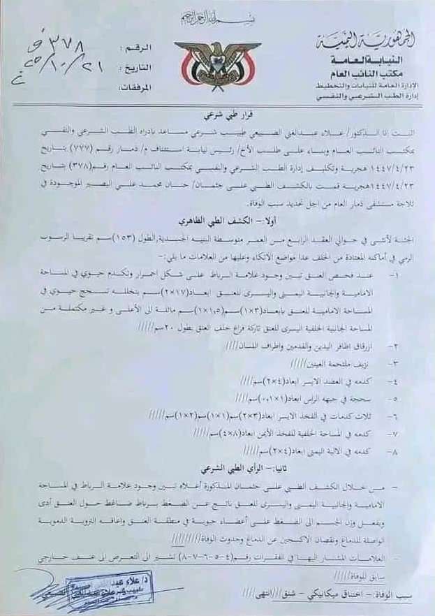 ذمار: تقرير الطب الشرعي يدين مبروك طيرة بقتل زوجته حنان البصير