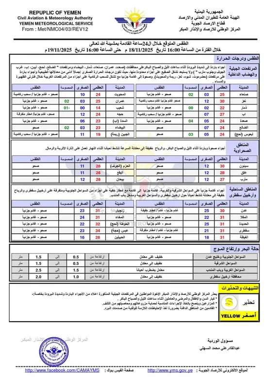 فيما يلي بيان بدرجات الحرارة المتوقعة في اليمن: