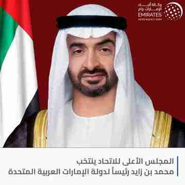 انتخب المجلس الأعلى للاتحاد اليوم بالإجماع صاحب السمو الشيخ محمد بن زايد آل نهيان رئيساً لدولة الإمارات العربية المتحدة. وعقد المجلس اجتماعاً اليوم في قصر المشرف بأبوظبي برئاسة صاحب السمو الشيخ محمد بن راشد آل مكتوم نائب رئيس الدولة رئيس مجلس الوزراء حاكم دبي "رعاه الله". حضر الاجتماع .. صاحب السمو الشيخ محمد بن زايد آل نهيان وصاحب السمو الشيخ الدكتور سلطان بن محمد القاسمي عضو المجلس الأعلى حاكم الشارقة وصاحب السمو الشيخ حميد بن راشد النعيمي عضو المجلس الأعلى حاكم عجمان وصاحب السمو الشيخ حمد بن محمد الشرقي عضو المجلس الأعلى حاكم الفجيرة وصاحب السمو الشيخ سعود بن راشد المعلا عضو المجلس الأعلى حاكم أم القيوين وصاحب السمو الشيخ سعود بن صقر القاسمي عضو المجلس الأعلى حاكم رأس الخيمة. وذكر بيان صادر من وزارة شؤون الرئاسة أنه تم بموجب المادة 51 من الدستور انتخاب صاحب السمو الشيخ محمد بن زايد آل نهيان بالإجماع رئيساً لدولة الإمارات العربية المتحدة خلفاً للمغفور له فقيد الوطن الشيخ خليفة بن زايد آل نهيان. وأكد أصحاب السمو الشيوخ أعضاء المجلس الأعلى للاتحاد حرصهم البالغ على الوفاء لما أرساه الراحل فقيد الوطن من قيم أصيلة ومبادئ استمدها من المؤسس المغفور له الشيخ زايد بن سلطان آل نهيان طيب الله ثراه، والتي رسخت مكانة دولة الإمارات العربية المتحدة على المستويين الإقليمي والعالمي وتعززت إنجازاتها الوطنية المختلفة. وأعرب المجلس عن ثقته التامة بأن شعب دولة الإمارات سيبقى كما أراده زايد والمؤسسون دوما حارساً أميناً للاتحاد ومكتسباته على جميع المستويات ..داعين الله عز وجل أن يوفق صاحب السمو الشيخ محمد بن زايد آل نهيان ويسدد خطاه في خدمة وطنه وشعب الإمارات الكريم. من جانبه أعرب صاحب السمو الشيخ محمد بن زايد آل نهيان عن تقديره للثقة الغالية التي أولاه إياها إخوانه أصحاب السمو الشيوخ أعضاء المجلس الأعلى للاتحاد حكام الإمارات راجياً المولى عز وجل أن يوفقه ويعينه على حمل مسؤولية هذه الأمانة العظيمة وأداء حقها في خدمة وطنه وشعب الإمارات الوفي.