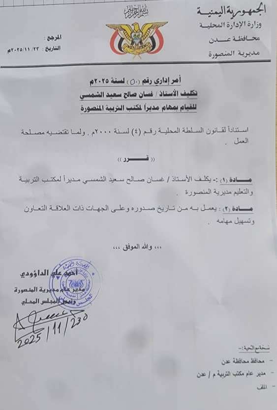 وقضي الأمر الإداري - في مادته الأولى - الذي حمل رقم ( 50 ) لعام 2025م، إستناداً لقانون السلطة المحلية رقم ( 4 ) لسنة 2000م، لما تقتضيه مصلحة العمل، بتكليف الأخ غسان صالح سعيد الشمسي، مديراً لمكتب التربية والتعليم في مديرية المنصورة.