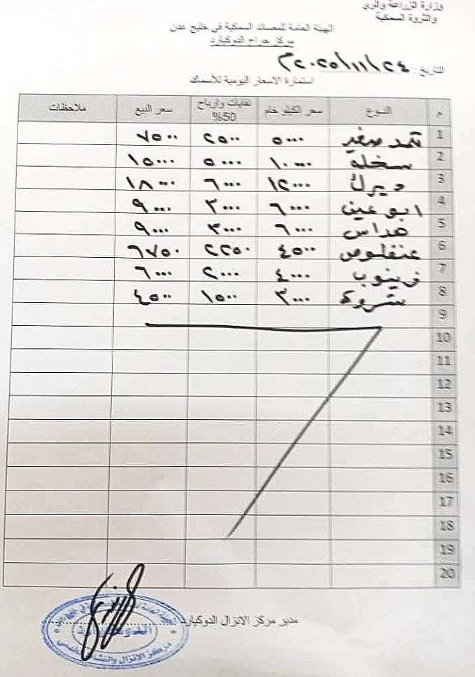 وفي ظل هذا الواقع، أعلنت السلطة المحلية في مديرية صيرة، الاثنين، تنفيذ حملة لضبط ما وصفته بـ"المتلاعبين بأسعار الأسماك"، محذرة الباعة من البيع بأسعار غير رسمية. غير أن مواطنين يرون أن هذه الحملات لا تعكس حقيقة الأزمة، إذ إن الأسعار المعلنة من الهيئة العامة للمصائد نفسها مرتفعة وثابتة منذ فترة طويلة، ما يجعل الحديث عن "ضبطها" نوعًا من التلاعب والضحك على الناس.