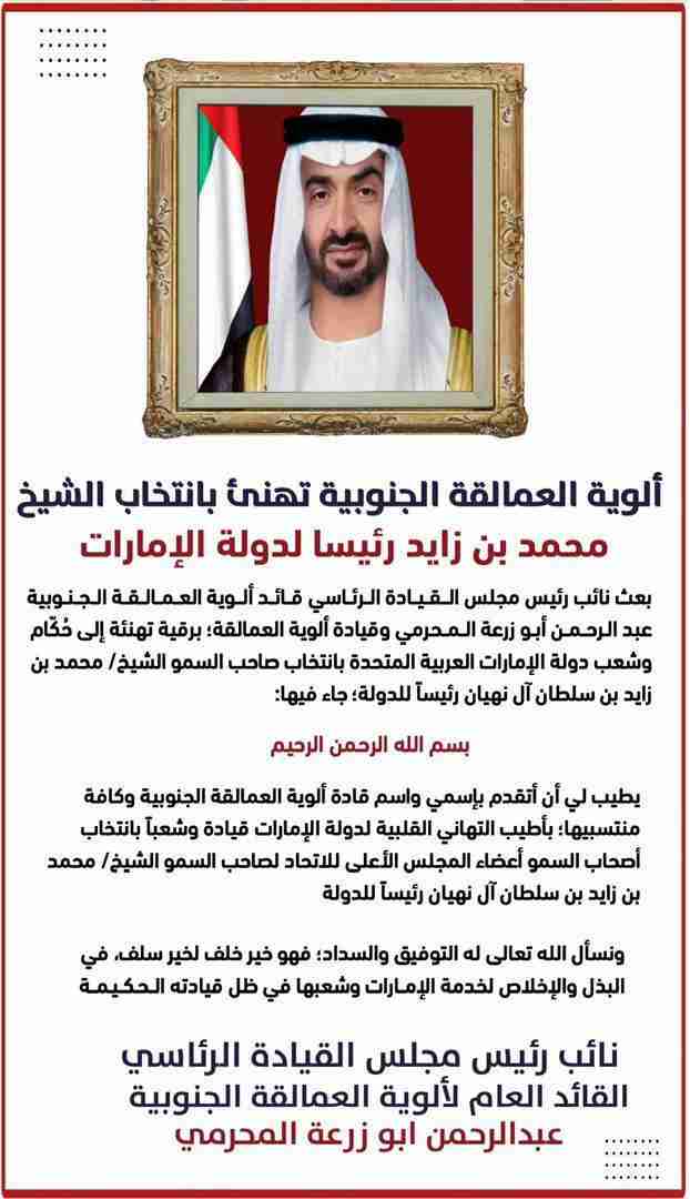 يطيب لي أن أتقدم بإسمي واسم قادة ألوية العمالقة الجنوبية وكافة منتسبيها؛ بأطيب التهاني القلبية لدولة الإمارات قيادة وشعباً بانتخاب أصحاب السمو أعضاء المجلس الأعلى للاتحاد لصاحب السمو الشيخ/ محمد بن زايد بن سلطان آل نهيان رئيساً للدولة.