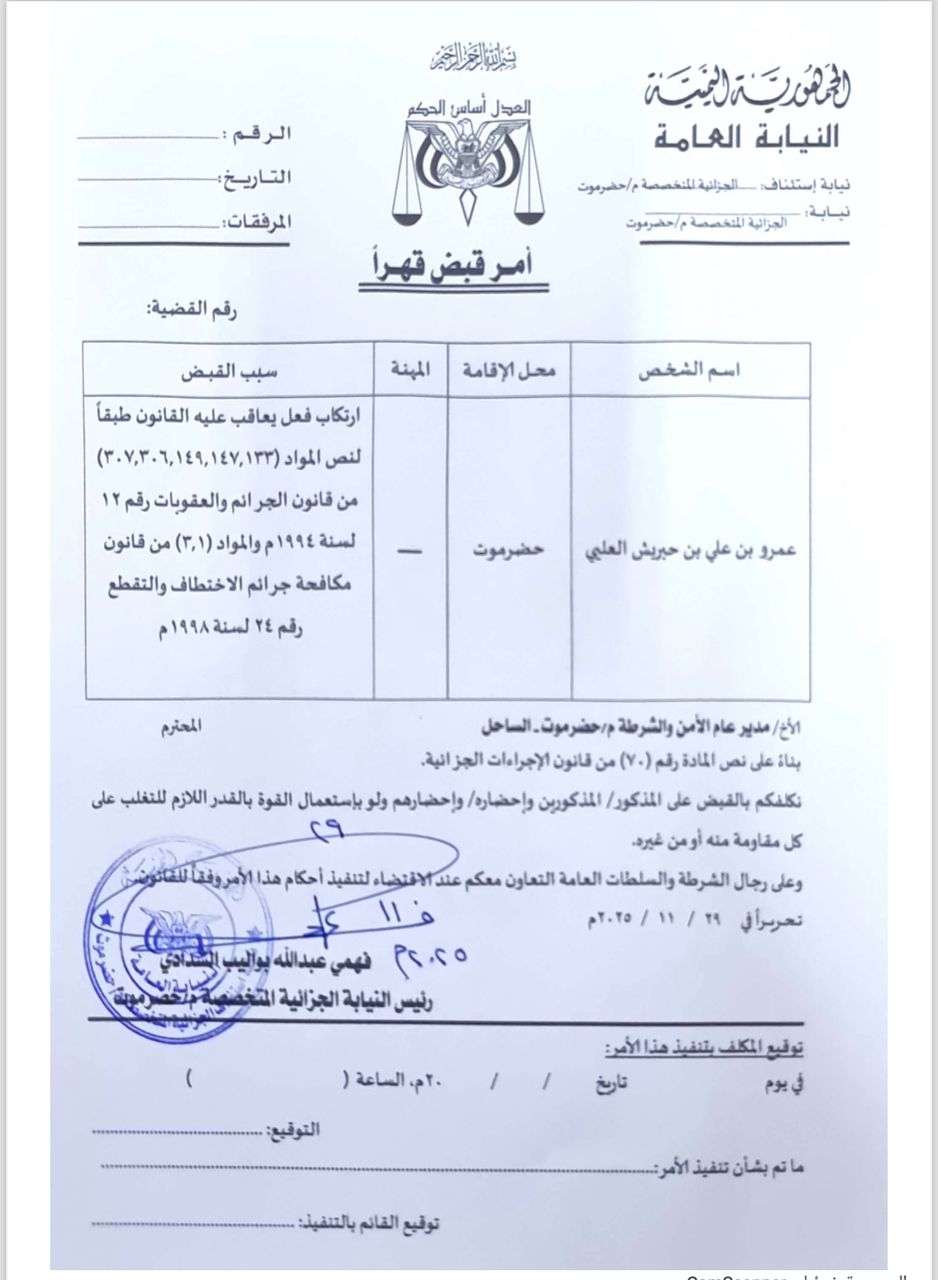 أفادت مصادر قضائية أن النيابة العامة أصدرت أوامر قبض قهرية بحق كلٍ من عمرو بن حبريش ومبارك أحمد العوبثاني على خلفية اتهامات بارتكاب أفعال يعاقب عليها القانون.