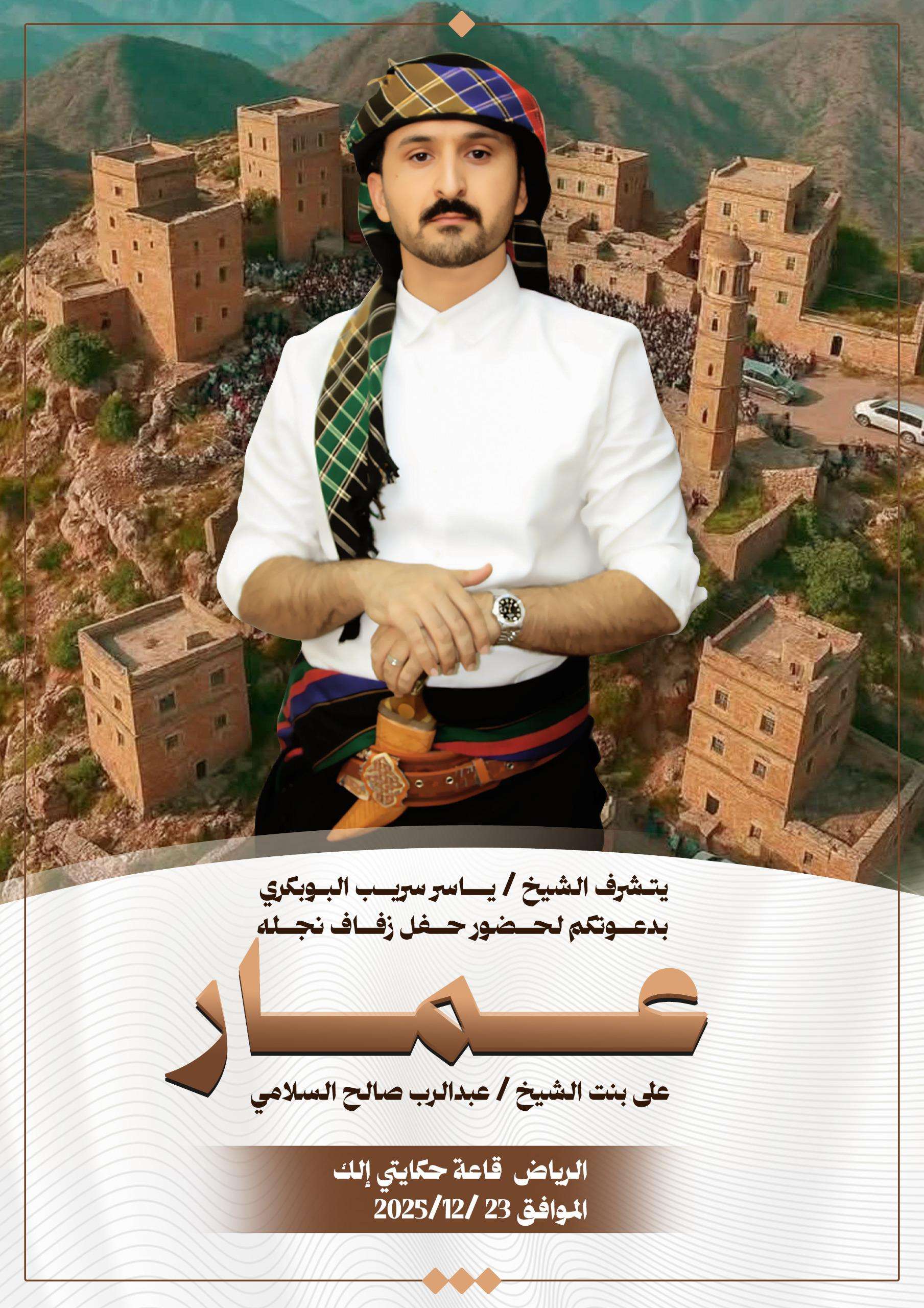 يتشرّف الشيخ ياسر سريب البوبكري بدعوة الأهل والأصدقاء وكافة المحبين لمشاركته أفراحه بمناسبة زفاف نجله عمار، على إبنة الشيخ عبدالرب صالح السلامي، وذلك في حفل بهيج يُقام يوم الثلاثاء الموافق 23 ديسمبر 2025م، في قاعة حياتي إليك بالعاصمة السعودية الرياض.