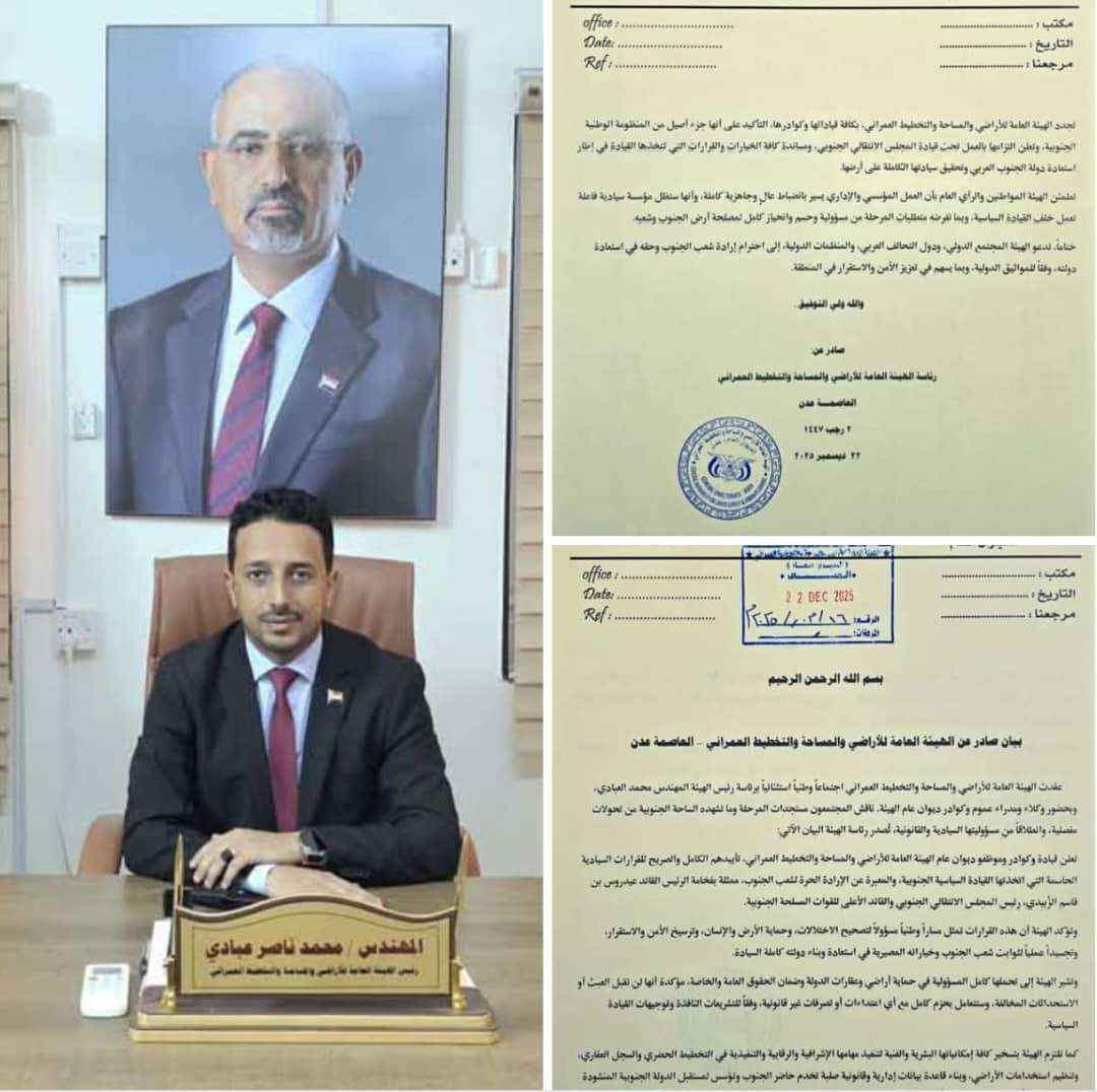تعلن قيادة وكوادر وموظفو ديوان عام الهيئة العامة للأراضي والمساحة والتخطيط العمراني، تأييدهم الكامل والصريح للقرارات السيادية الحاسمة التي اتخذتها القيادة السياسية الجنوبية، والمعبرة عن الإرادة الحرة لشعب الجنوب، ممثلة بفخامة الرئيس القائد عيدروس بن قاسم الزُبيدي، رئيس المجلس الانتقالي الجنوبي والقائد الأعلى للقوات المسلحة الجنوبية.