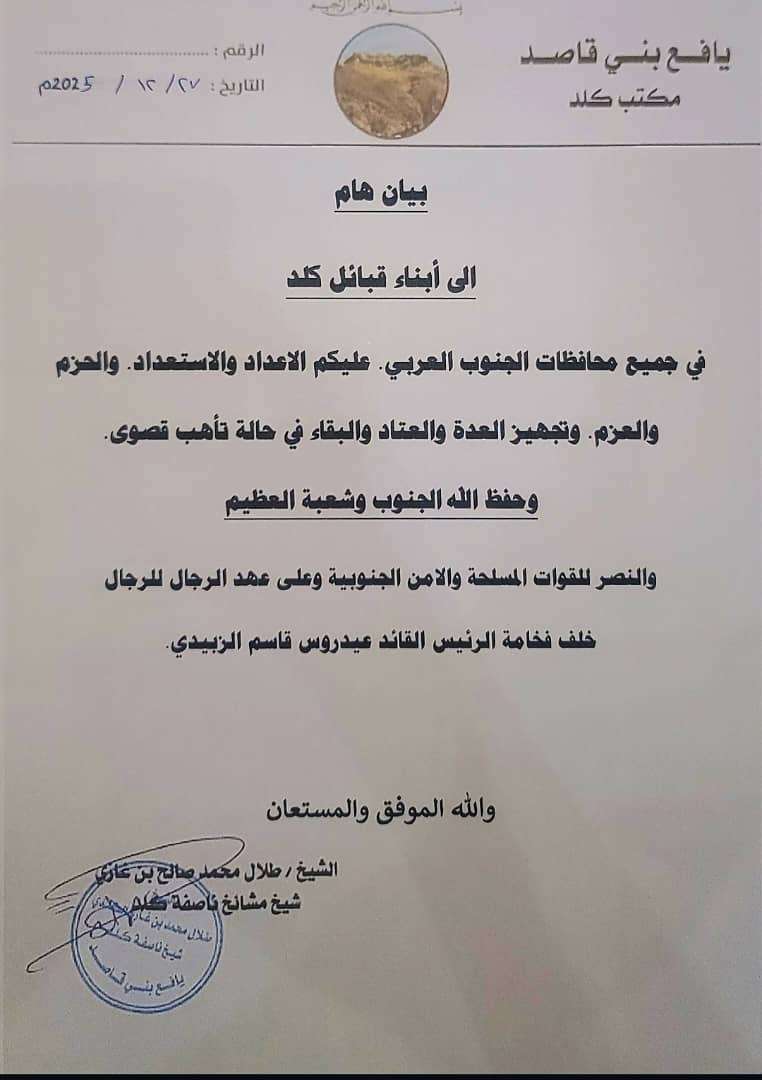 إلى أبناء قبائل كلد في جميع محافظات الجنوب العربي عليكم الإعداد والاستعداد ،والحزم والعزم ، وتجهيز العدة والعتاد والبقاء في حالة تأهب قصوى وحفظ الله الجنوب وشعبه العظيم .