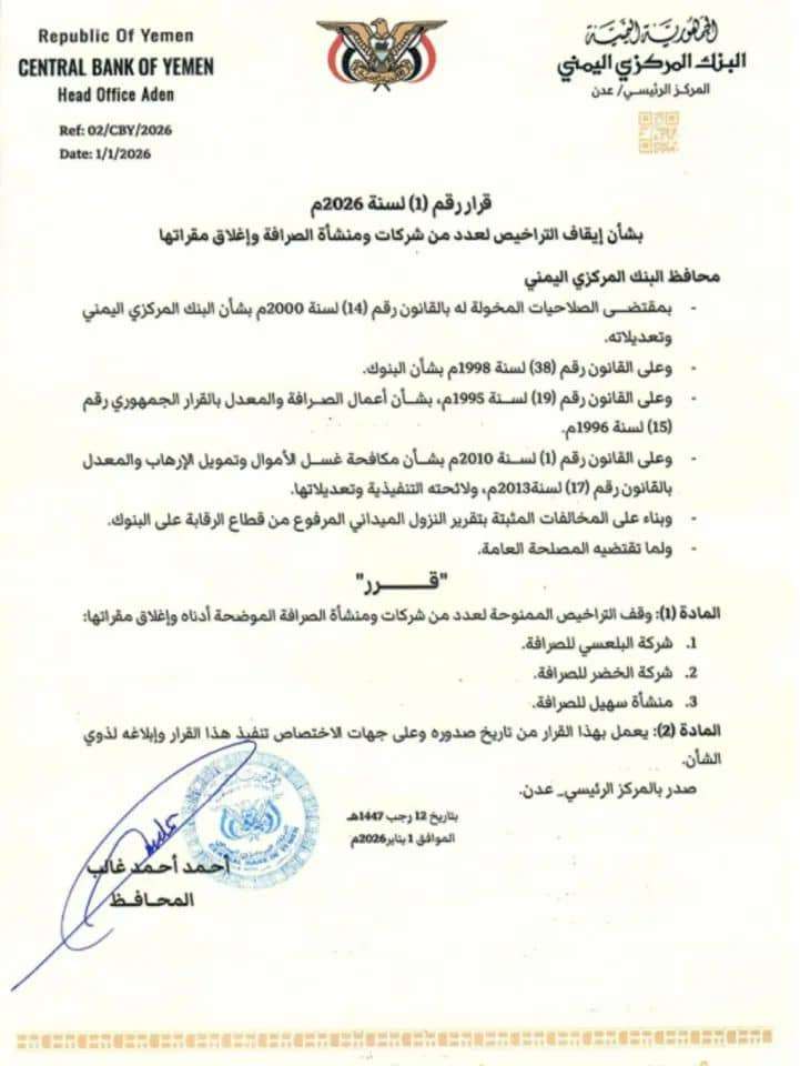أصدر محافظ البنك المركزي اليمني، الأستاذ أحمد أحمد غالب، اليوم الخميس، القرار رقم (1) لعام 2026، والذي قضى بإيقاف تراخيص عدد من شركات ومنشآت الصرافة في العاصمة عدن، وإغلاق مقرّاتها حتى إشعار آخر.