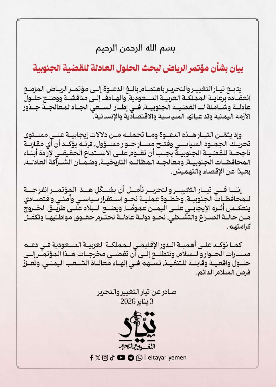 وفي بيان صادر عنه بتاريخ 3 يناير 2026، ثمّن التيار هذه الدعوة وما تحمله من دلالات إيجابية على صعيد تحريك المشهد السياسي، مؤكدًا أن أي مقاربة ناجحة لمعالجة القضية الجنوبية يجب أن تنطلق من الاستماع الحقيقي لإرادة أبناء المحافظات الجنوبية، ومعالجة المظالم التاريخية، وضمان شراكة عادلة تقوم على مبدأ التوافق، بعيدًا عن الإقصاء والتهميش.