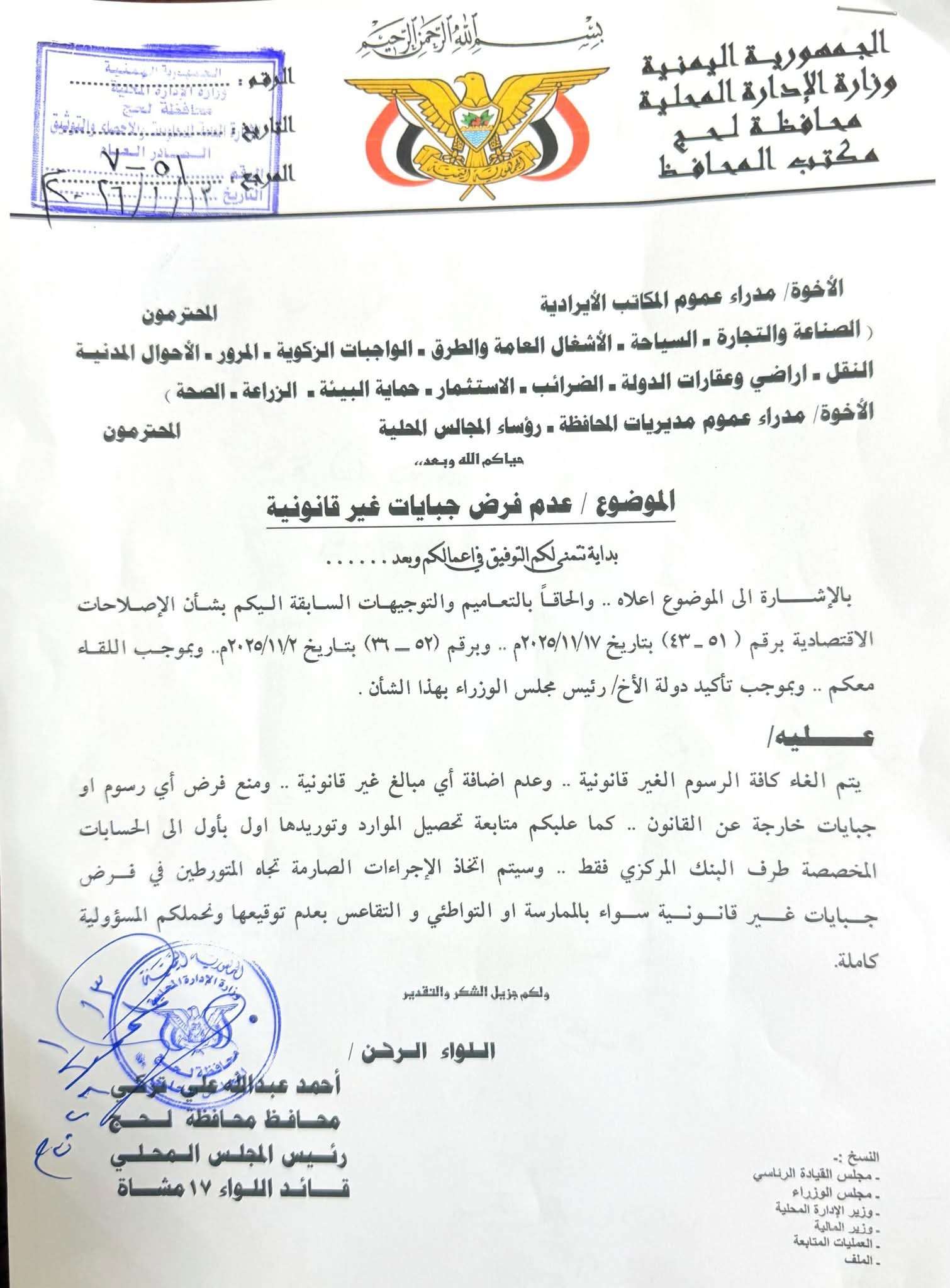أصدر محافظ محافظة لحج، اللواء الركن أحمد عبدالله علي تركي، توجيهات رسمية تقضي بإلغاء كافة الرسوم والجبايات غير القانونية، ومنع فرض أي مبالغ خارج الأطر القانونية، مع اتخاذ إجراءات صارمة بحق المخالفين، وتحميلهم المسؤولية الكاملة.