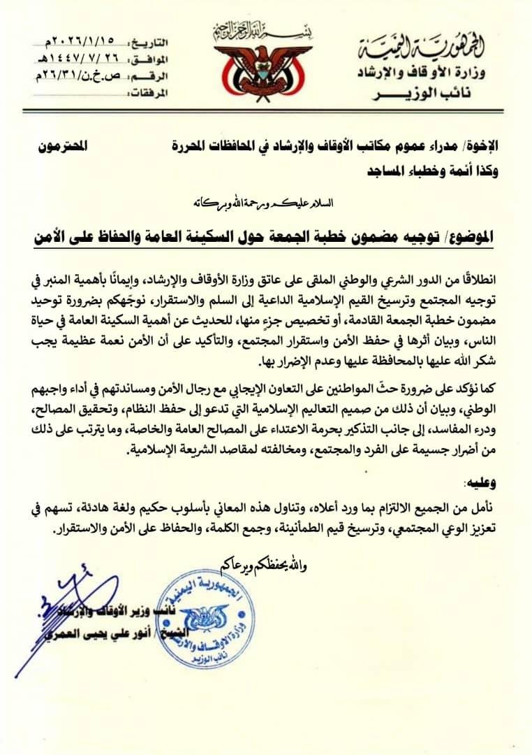 وجّهت وزارة الأوقاف والإرشاد مكاتبها في المحافظات المحررة، وكذا أئمة وخطباء المساجد، بتخصيص مضمون خطبة الجمعة القادمة للحديث عن أهمية السكينة العامة والحفاظ على الأمن والاستقرار، لما لذلك من دور محوري في استقرار المجتمع وحماية النسيج الاجتماعي.