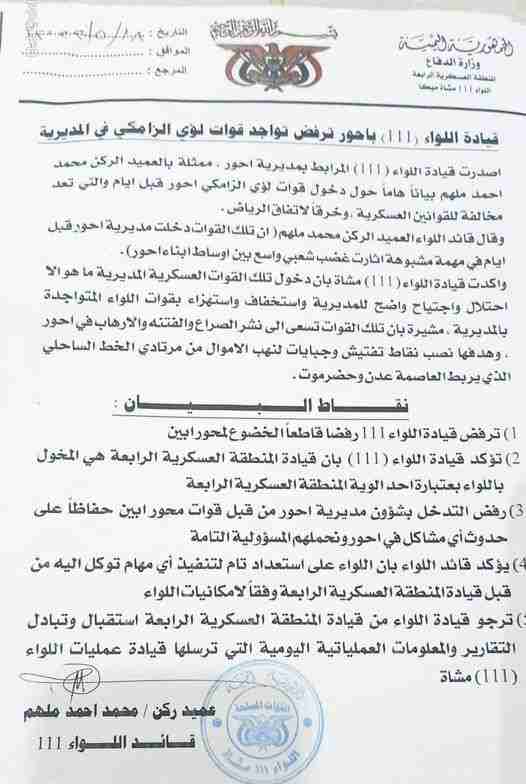 أصدرت قيادة اللواء «111» المرابط بمديرية أحور، ممثلة بالعميد الركن محمد أحمد ملهم بيانا هاما حول دخول قوات لؤي الزامكي أحور قبل أيام والتي تُعد مخالفة للقوانين العسكرية، وخرقا لاتفاق الرياض.