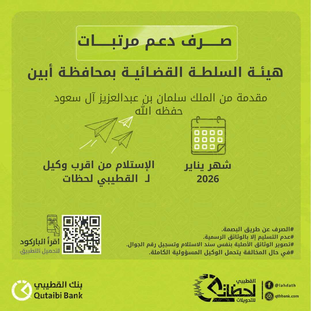 وأكد بنك القطيبي الإسلامي أن عملية الصرف تتم عبر فروعه في المحافظات المحررة، أو من خلال شبكة وكلاء "القطيبي لحظات" المنتشرة في المحافظات المشمولة، داعيًا المستفيدين إلى التوجه إلى أقرب فرع أو وكيل لاستلام مستحقاتهم وفق الضوابط المعتمدة.