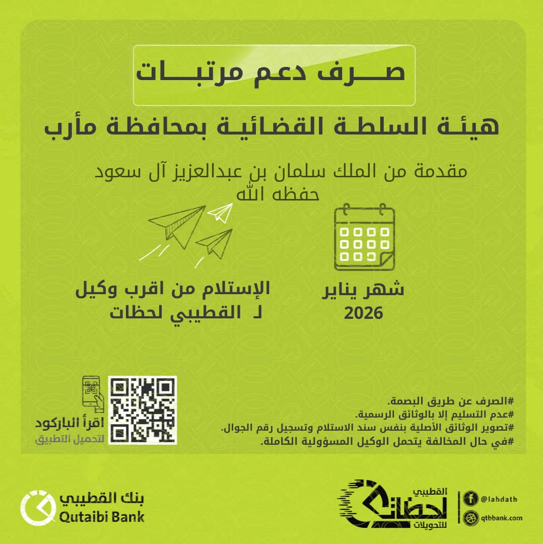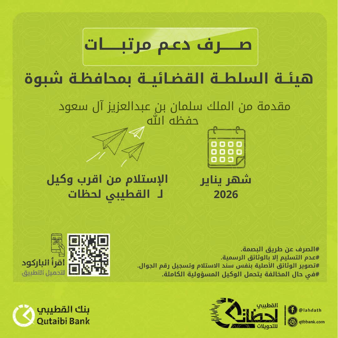 أعلن بنك القطيبي الإسلامي عن بدء صرف مرتبات منتسبي السلطة القضائية في عدد من المحافظات، شملت مأرب، شبوة، الضالع، وأبين، وذلك عن شهر يناير 2026، ضمن آلية منظمة تهدف إلى ضمان سرعة الاستلام وسلامة الإجراءات المالية والإدارية.