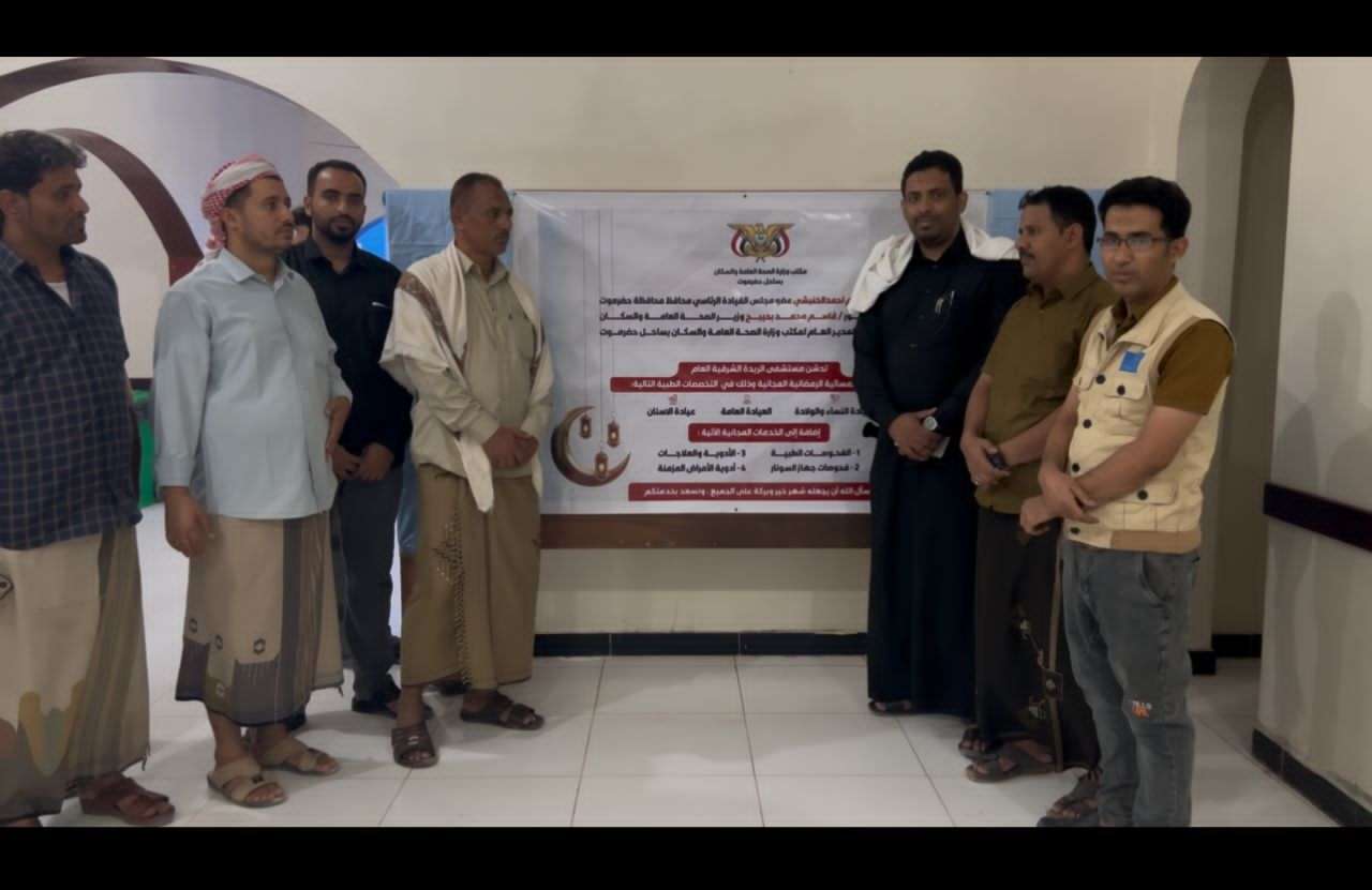 دشن الدكتور أحمد محمد بن نويصر، المدير العام لمكتب وزارة الصحة العامة والسكان بساحل حضرموت، بمعية الأستاذ عبدالباسط باحميد، المدير العام، والأستاذ فؤاد سعيد السهب، مدير مكتب الصحة والسكان بمديرية الريدة وقصيعر، بحضور الأستاذ علي عمر باجوه، نائب المدير العام لمكتب وزارة الصحة العامة والسكان لشؤون التخطيط والتنمية الصحية، مساء يوم السبت 4 رمضان، تدشين العيادات المسائية الرمضانية المجانية بمستشفى الريدة الشرقية العام، برعاية الأستاذ سالم أحمد الخنبشي، عضو مجلس القيادة الرئاسي، محافظ محافظة حضرموت، والأستاذ الدكتور قاسم محمد بحيبح، معالي وزير الصحة العامة والسكان.