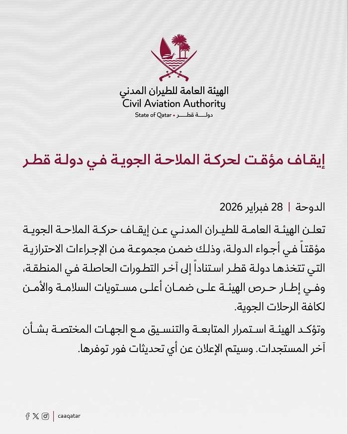 أعلن الهيئة العامة للطيران المدني عن إيقاف حركة الملاحة الجوية مؤقتا في أجواء الدولة، وذلك ضمن مجموعة من الإجراءات الاحترازية التي تتخذها دولة قطر استنادا إلى آخر التطورات الحاصلة في المنطقة، وفي إطار حرص الهيئة على ضمان أعلى مستويات السلامة والأمن لكافة الرحلات الجوية.