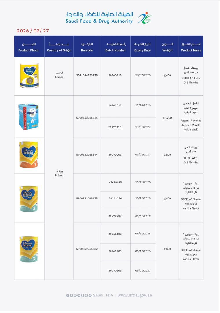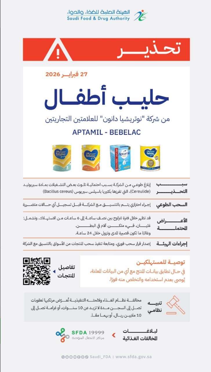 اصدرت الهيئة اليمنية للمواصفات والمقاييس وضبط الجودة اليوم الاثنين الموافق 2 مارس 2026م، تعميم برقم (11) لعام 2026م بشأن التحذيرات الصادرة عن الهيئة العامة للغذاء والدواء السعودية بخصوص سحب علامات تجارية لمنتجات حليب اطفال ملوثة .